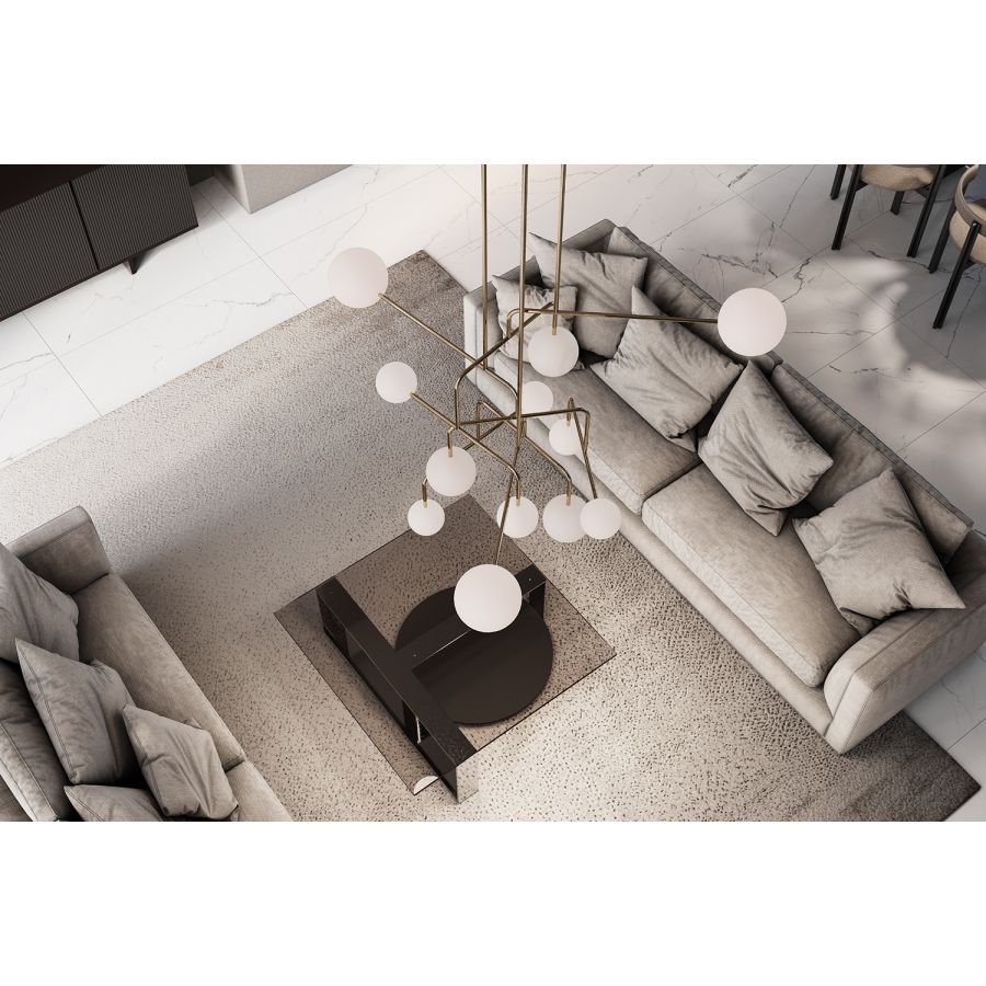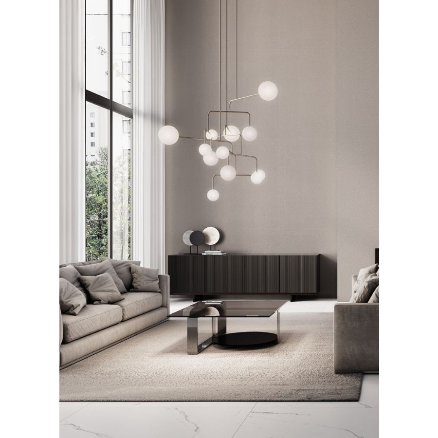 Vi älskar verkligen CONSTELLATION eftersom den tillåter oss att leka med dess komposition, med utgångspunkt från en basstruktur som kan reproduceras genom att lägga till stänger i olika längder för att skapa kompositioner med större volym. Vi tycker också att CONSTELLATION är mycket vacker och en kraftfull fokuspunkt; vi anser den idealisk för kommersiella lokaler, för ett vardagsrum eller ett matrum i ett hem, eller installerad i restaurangutrymmen, hotell och i allmänhet i områden som kräver en iögonfallande samt mycket dekorativ och trendig hängande lampa.