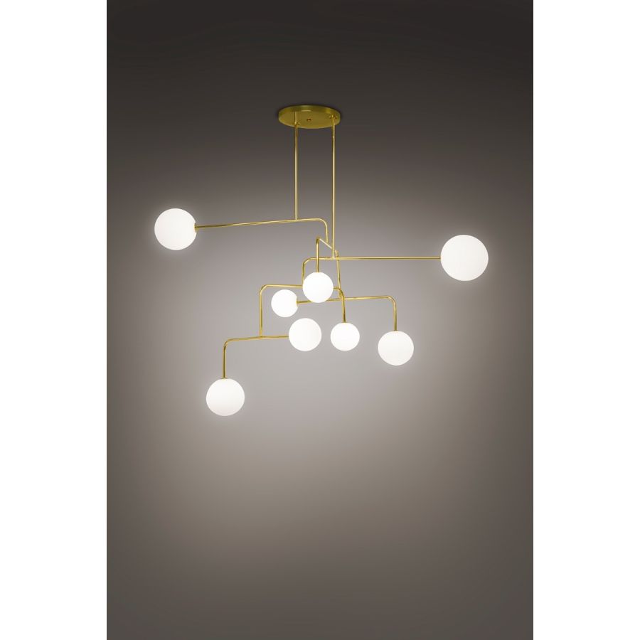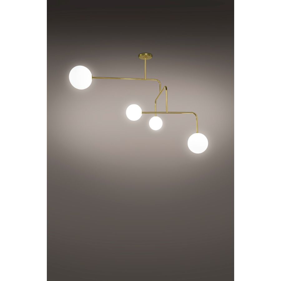 CONSTELLATION är en kollektion som å ena sidan är inspirerad av de mobiler som utvecklades av Alexander Calder och Joan Miró, skapade nästan samtidigt med samma namn, utan att de kände till varandras arbete, var och en inom sitt eget område: Calder inom skulptur och Miró inom måleri. Å andra sidan är CONSTELLATION också inspirerad av fascinationen som orsakas av kosmos konstellationer, stjärnorna, deras balans och skönhet. CONSTELLATION är en slående och asymmetrisk armatur som, trots sina komplexa konfigurationer, behåller en perfekt balans, vilket ger en dynamisk känsla åt rummet i ständig förändring, beroende på åskådarens synvinkel. Ett tunt metallrör ritar en struktur som slutar i blåsade glaskulor i tre olika diametrar, som sprider ljuset på ett mjukt och varmt sätt. CONSTELLATION ger en stilfull touch mellan 'Art-Déco' och Mid-century.