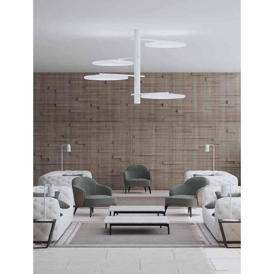 Denna kollektion är utrustad med LED-teknik på 40W som har ett betydande ljusflöde på 3250 lumens i en mycket behaglig ton på 3000K, i varje av dess månar. Strukturen presenteras i texturerat vitt, även om det är möjligt att anpassa den i specialfärg om så önskas.