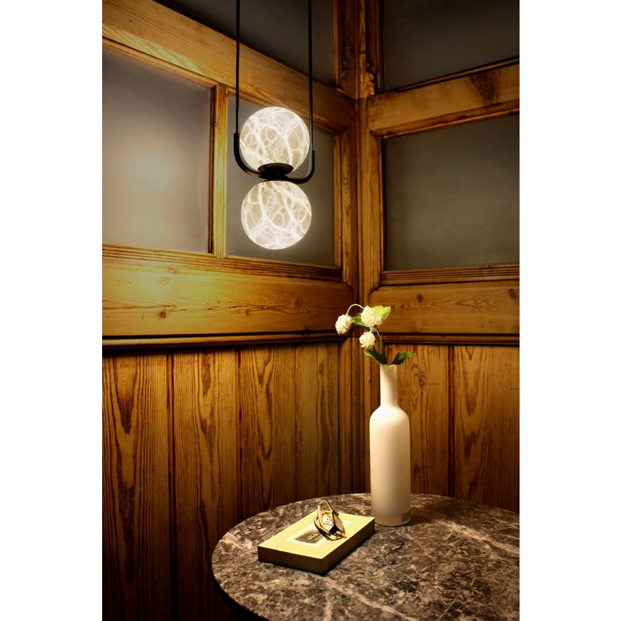 TRIBECA-kollektionen består av en enda pendel med en skärm och två överlagrade, en annan med fyra ljus med en linjär takkåpa, en bordslampa med en skärm, och två golvlampor med en skärm och två överlagrade skärmar. Slutligen har kollektionen en enkel vägglampa, en annan vägglampa med läsarm, och en downlight. Konstruktionerna är gjorda av texturerat svart järn och alla skärmar är 12cm-diameter alabastersfärer, som inkluderar en integrerad 4.5W 270lm 2700K LED.