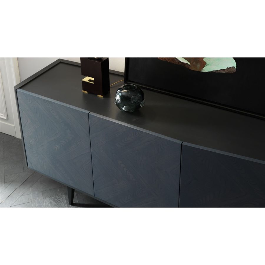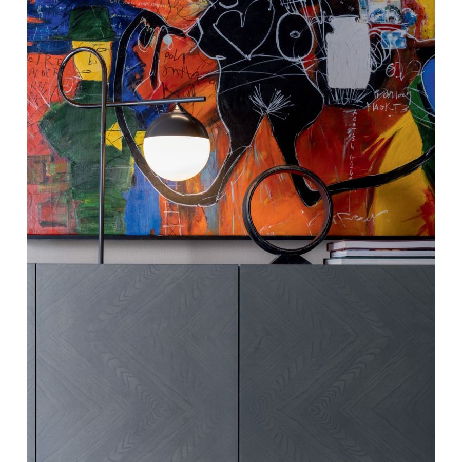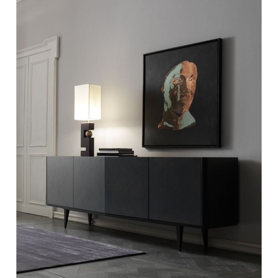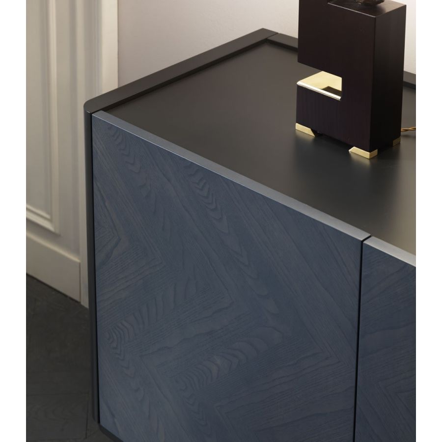 A refined and elegant sideboard, which is expressed through the precious play of inlays of ash leaves that characterize the doors. Graceful but effective chromatic and material contrasts, which distinguish the entire collection and enhance the dynamism of the forms.