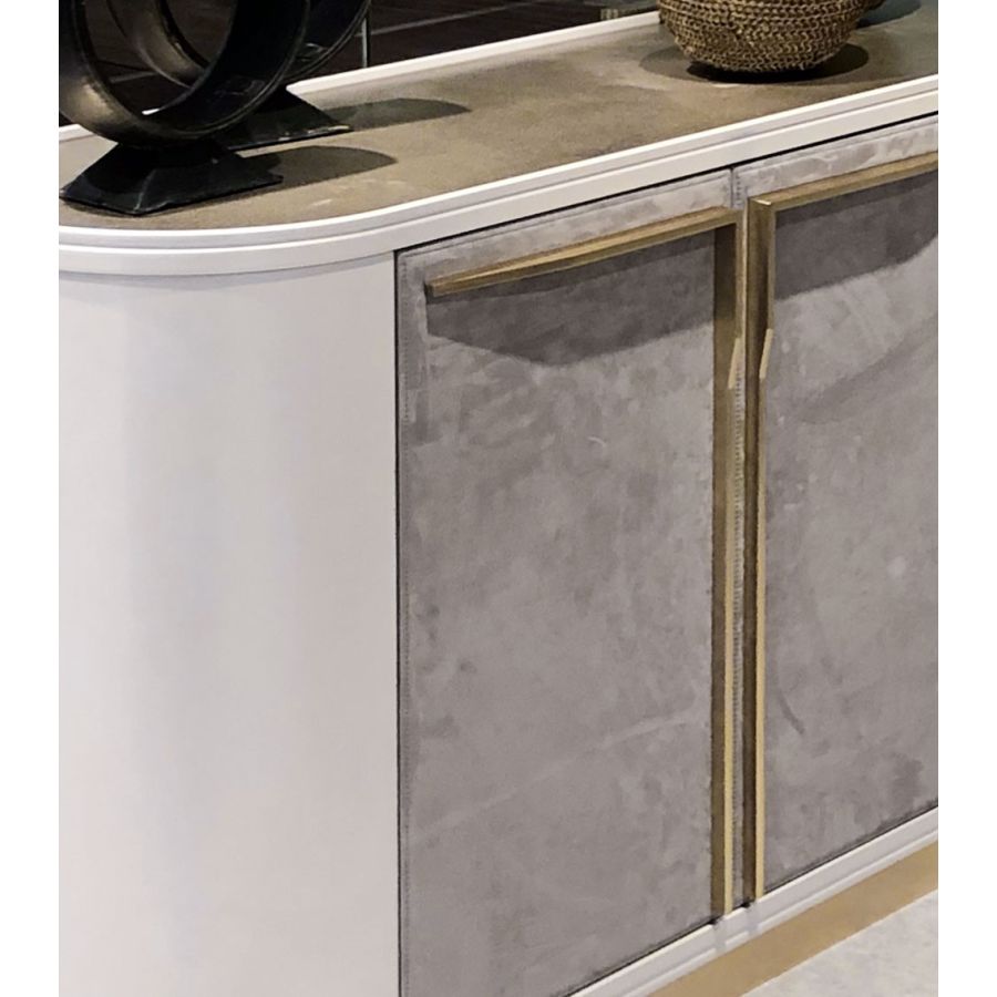 Ein elegantes und klares Sideboard mit einfachen, aber ungewöhnlichen Formen. Die Kombination edler Materialien, die schlanke Linie der Metallgriffe und des Sockels sowie die sorgfältig handgefertigten, lederbezogenen Türen ergeben die perfekte Mischung für ein stilvolles, elegantes und raffiniertes Sideboard.