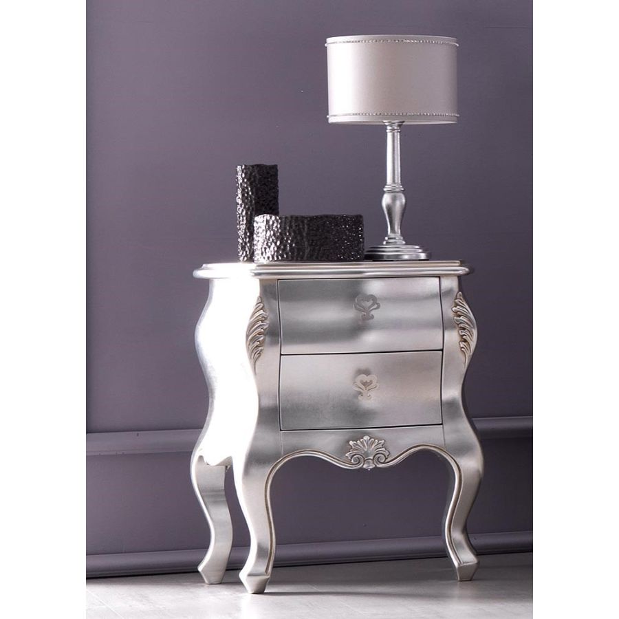 Wooden chestof 2 drawers and Wooden bedside table with 2 drawers of classic romantic line. Anteahas carved massive wooden legs, shaped sides and fronts. The classic style is underlined by the curves and by the refined carvings with floral pattern.Thanks to the wide range of varnished and brushed finishings Antea is a fresh and dateless item. Perfect and elegant the colour effect to create on the carved details.