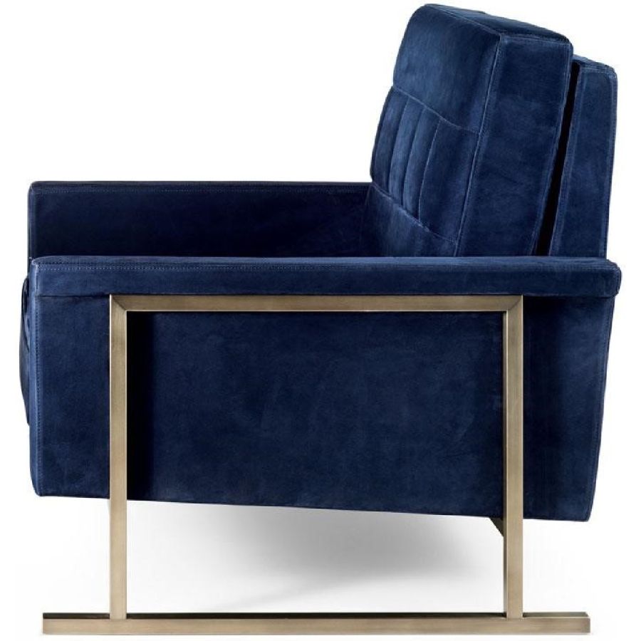 Tube-shaped metallic structure made of antiqued and burnished brass finishing. Blue china velvet, dark blue nubuck leather.