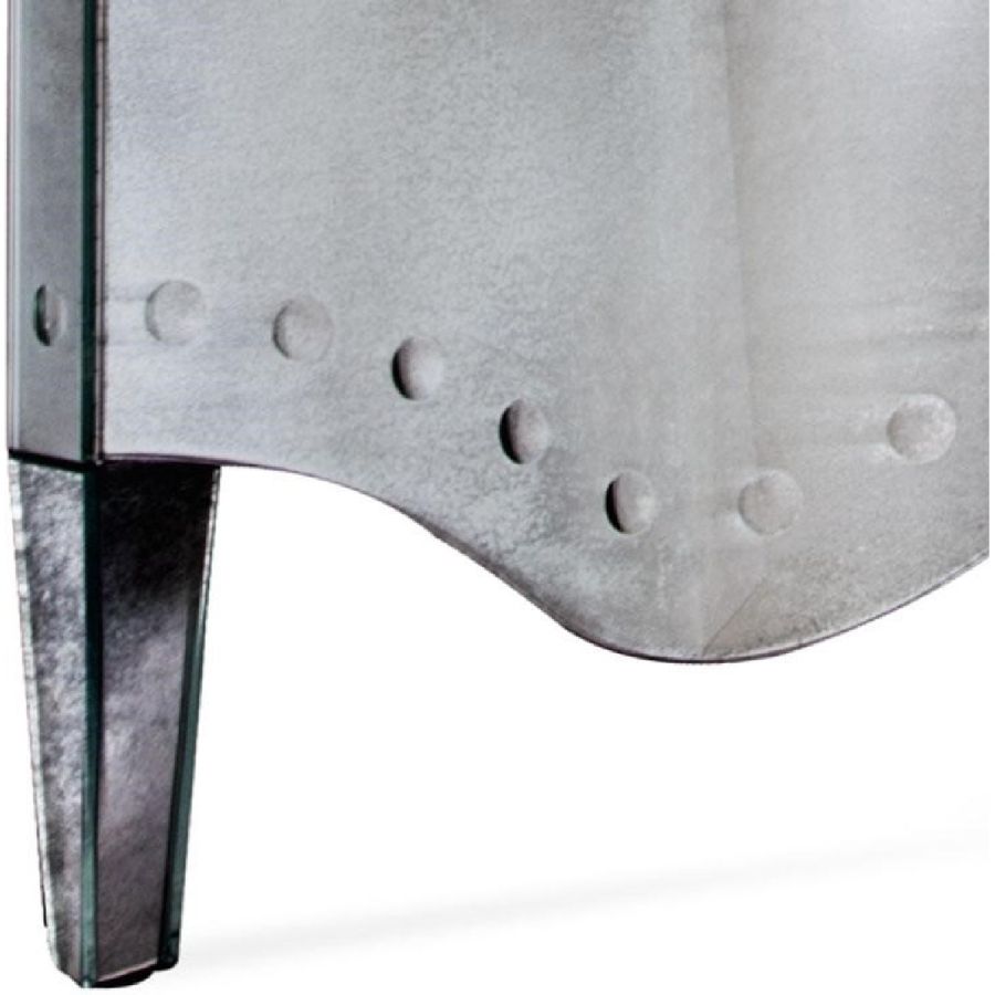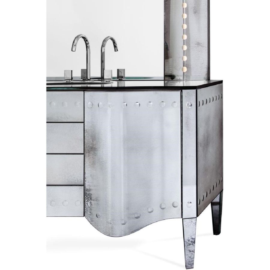 Shaped curved doors and side made of glass with medium antique mirror finish. Molten vanity top, 15mm thick, made of glass with medium antique mirror finish.
