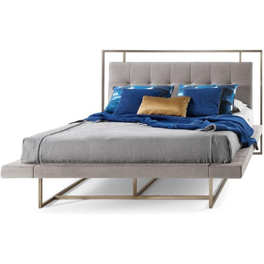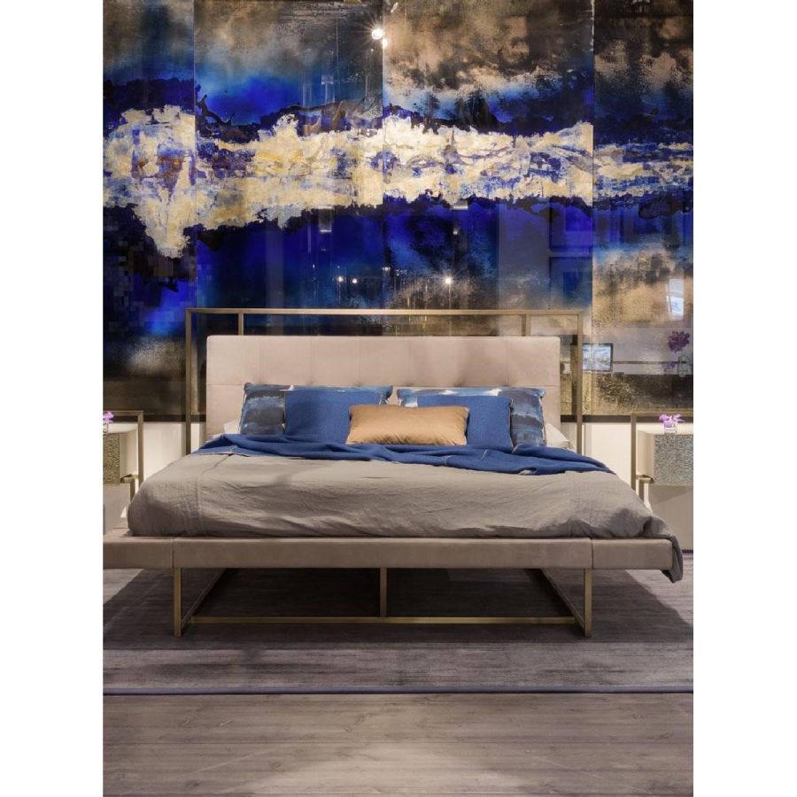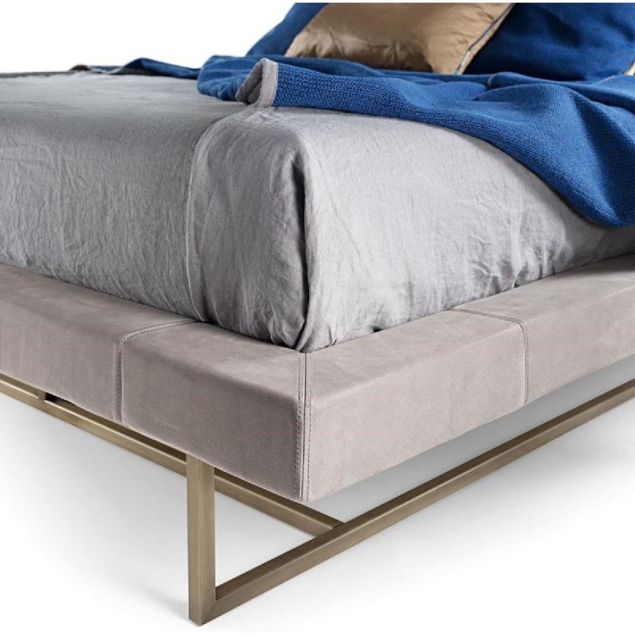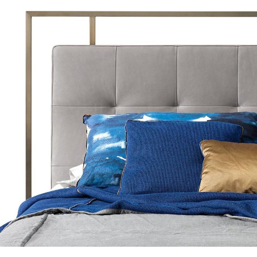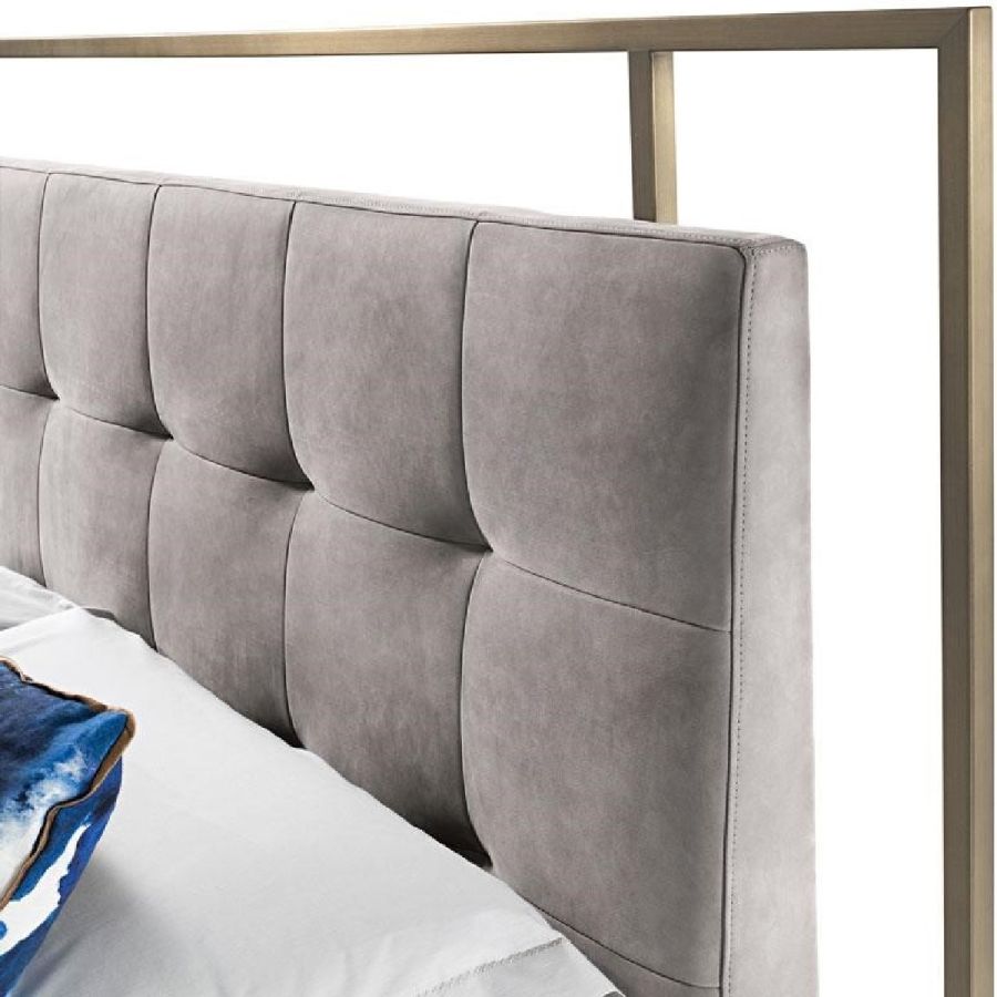 Tube-shaped metallic structure made of antiqued and burnished brass finishing. Tufted headboard made of light grey nubuck leather.
