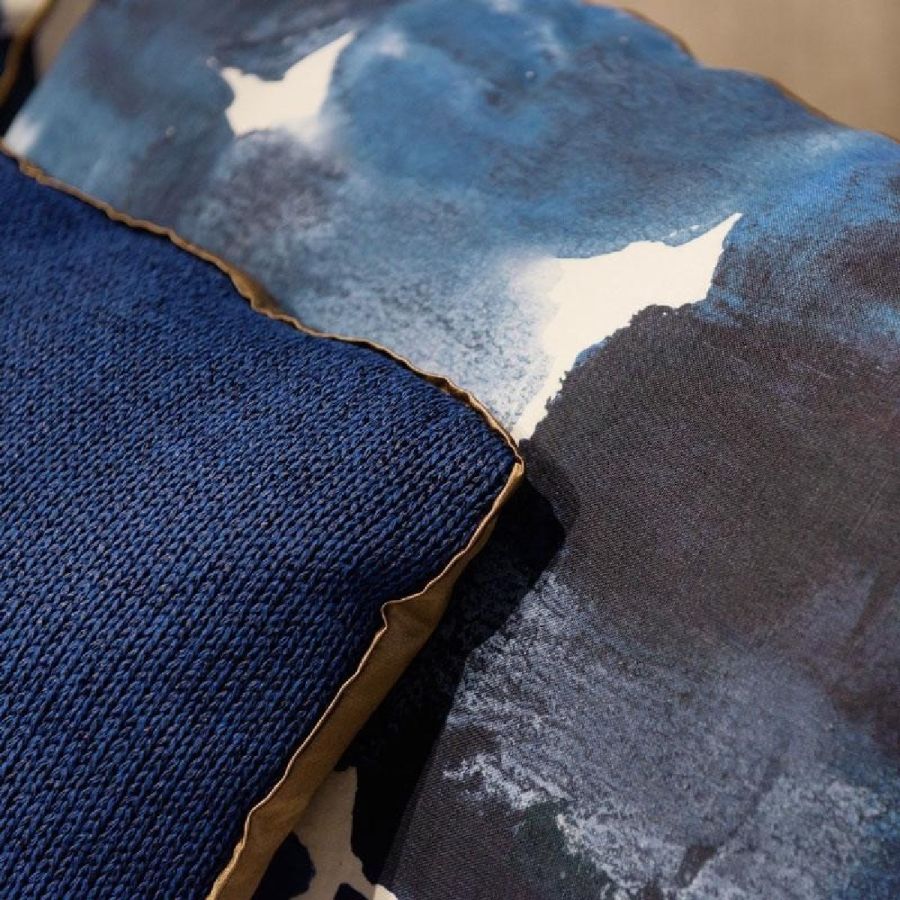 Bedcover made of a combination of Rubelli’s ash-grey and blue china, weft twist fabric.