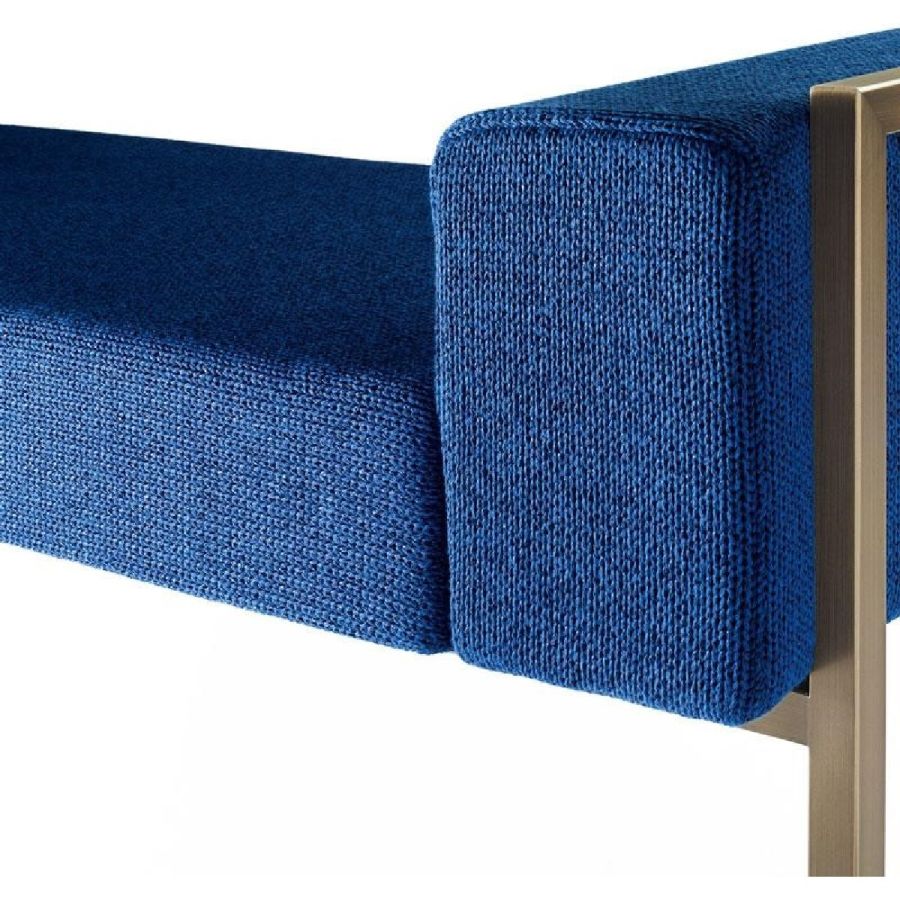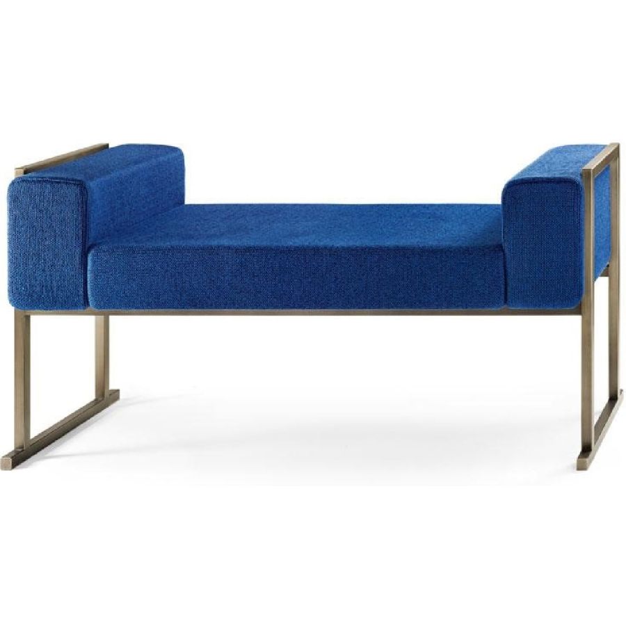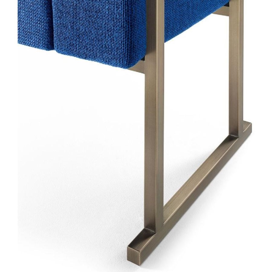 Tube-shaped metallic structure made of antiqued and burnished brass finishing. Prestigious, blue china fabric with a twist texture.