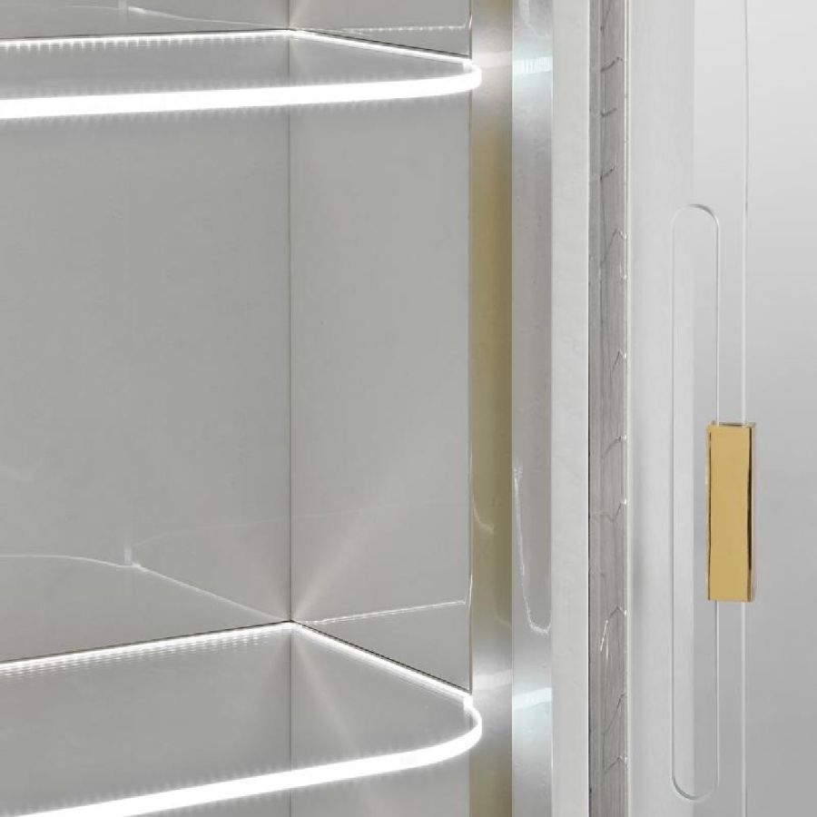 Two glass shelves and LED lighting on the inside. Handles made of glass with shiny brass details.