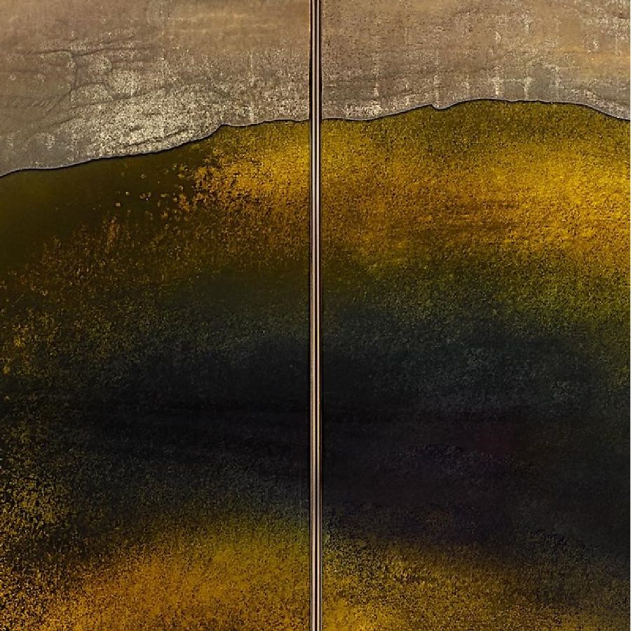 Lacquered brushed ash wood veneered plywood structure. Two doors in extra-clear glass decorated with Limides finish.