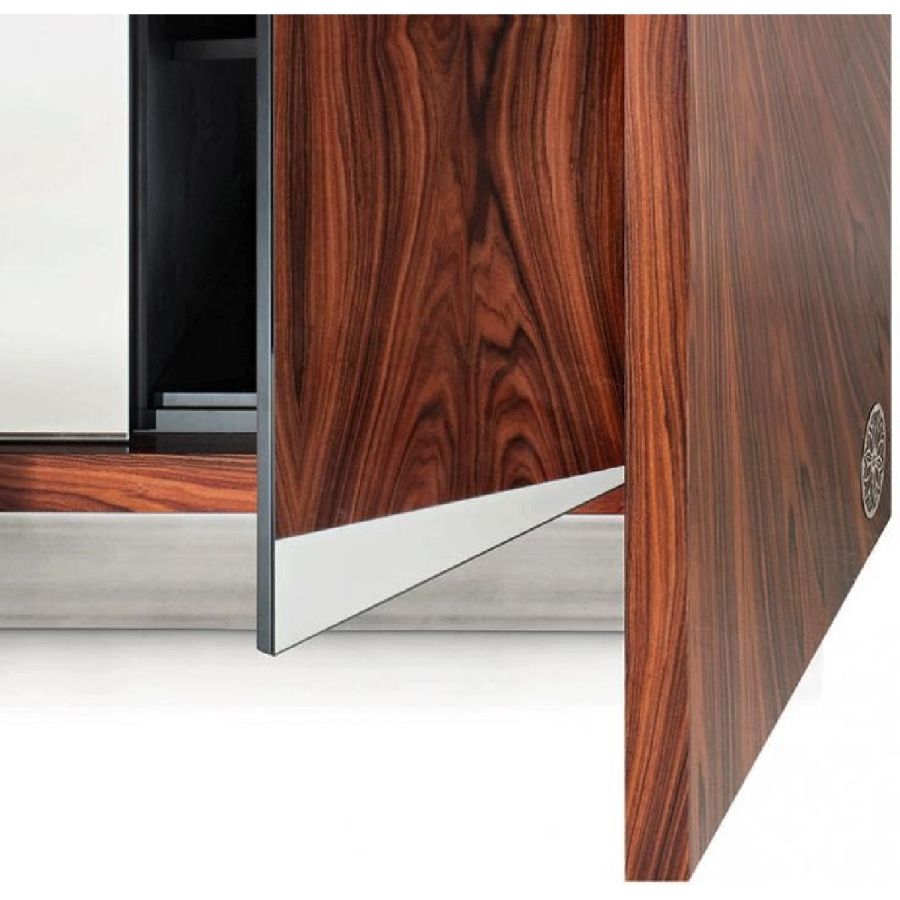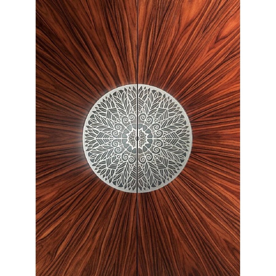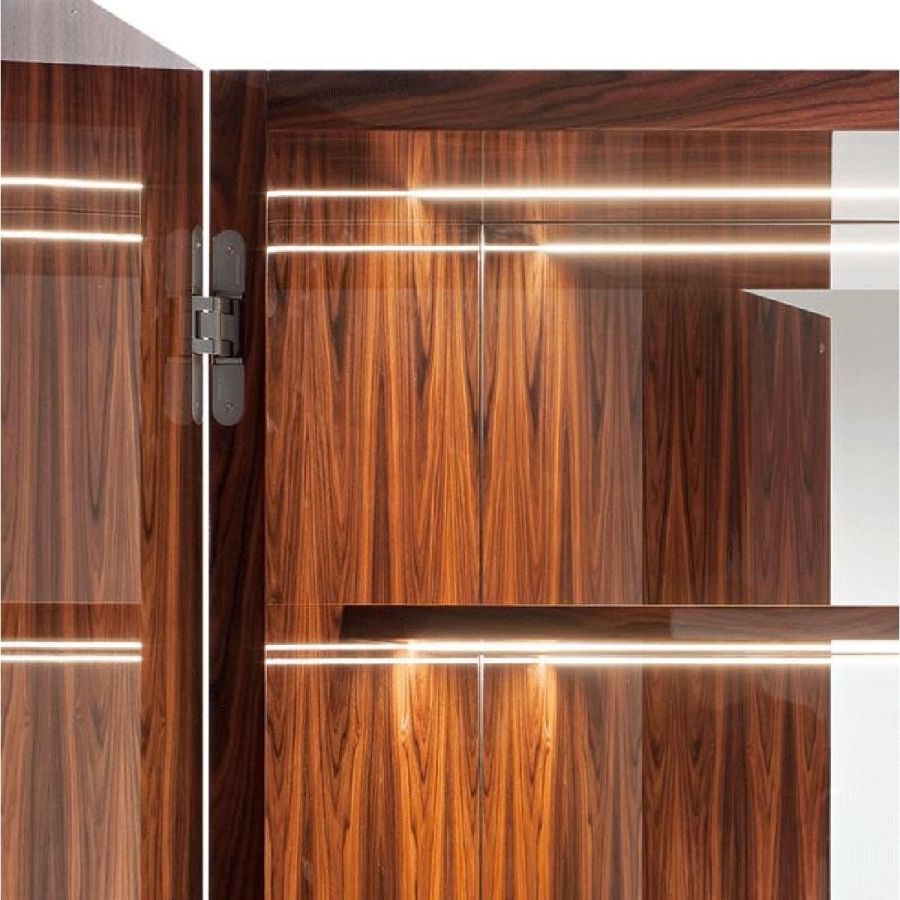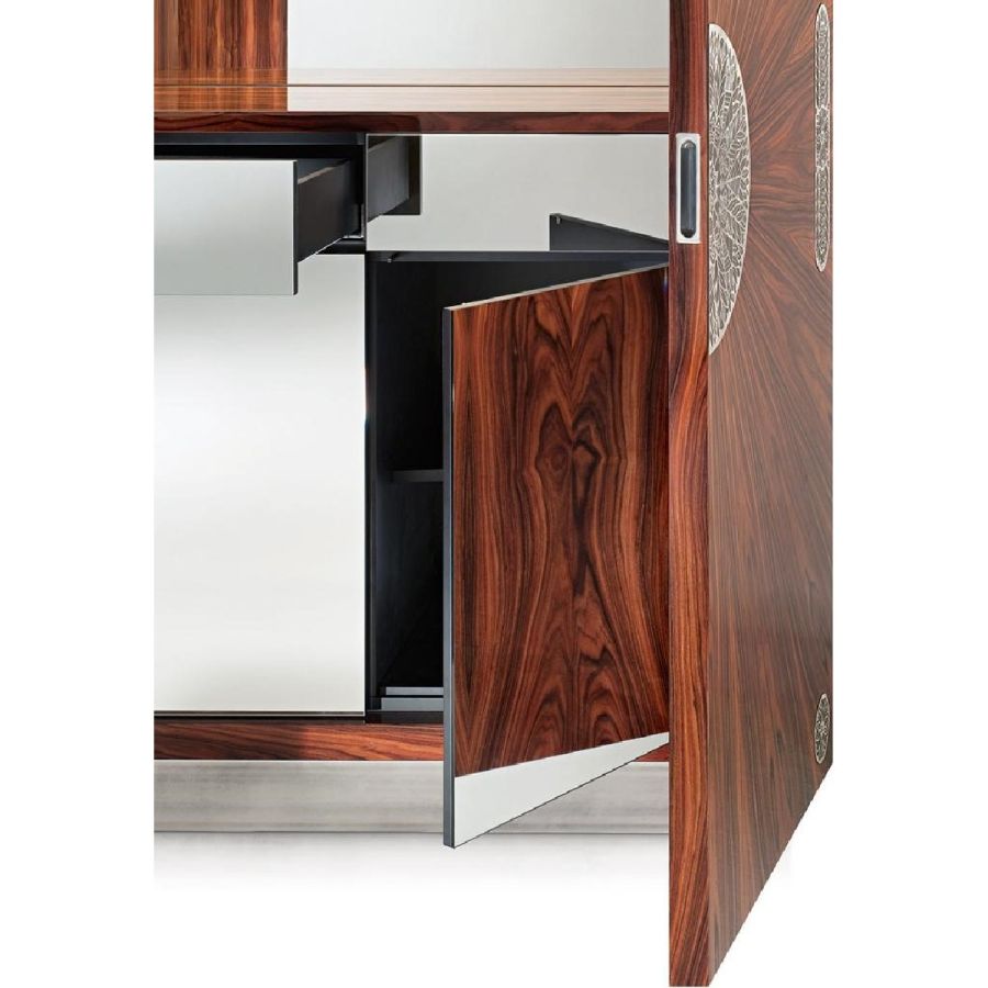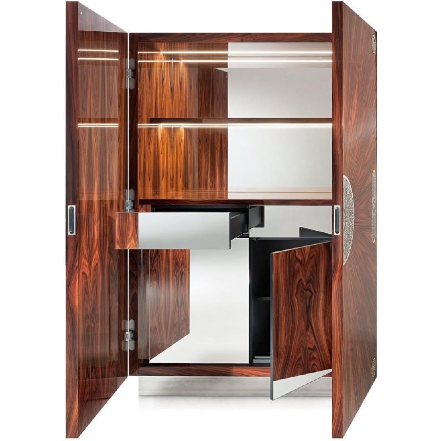 Cabinet bar made of shiny varnished rosewood and photoengraved brass inserts with antiqued silvery effect. LED interior lights, storage made of wood and mirror.