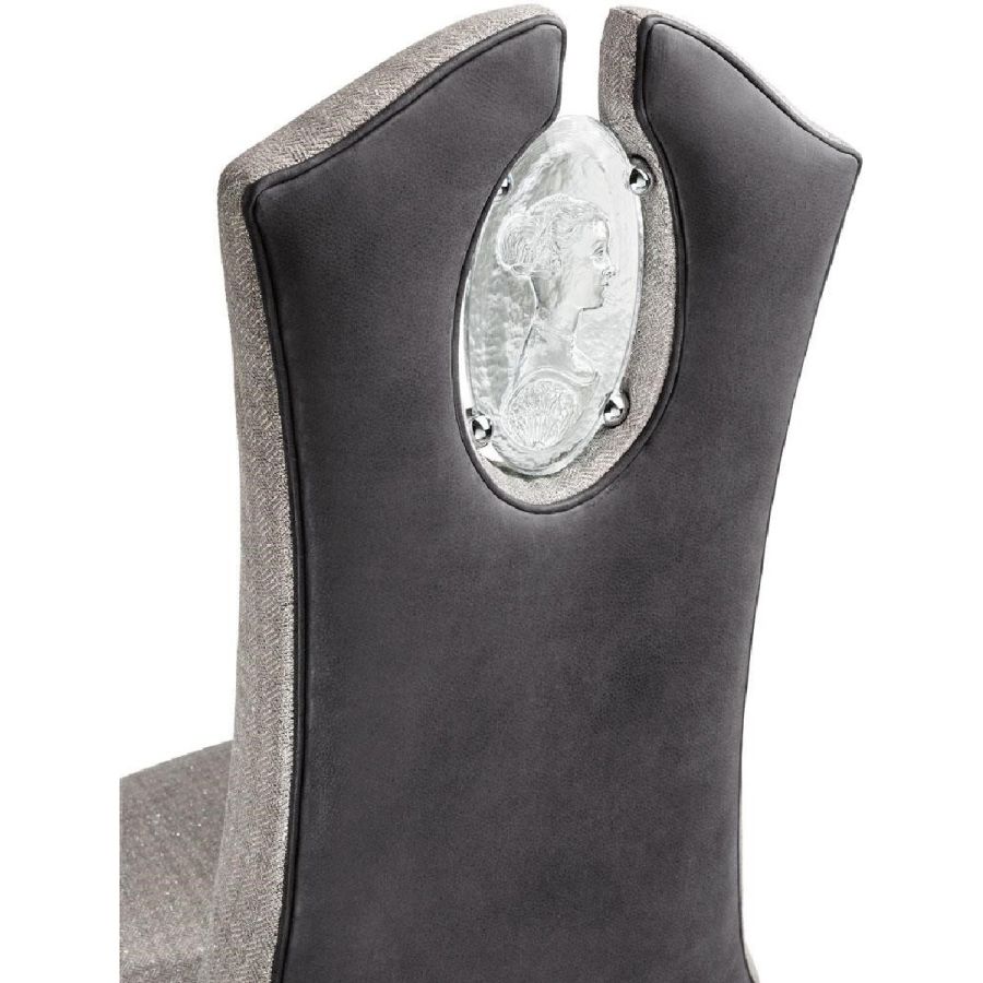 “Cameo” oval-shaped and transparent cast glass decor with a depiction of a noble lady. Spherical screws made of brass with shiny chrome-plated finish.