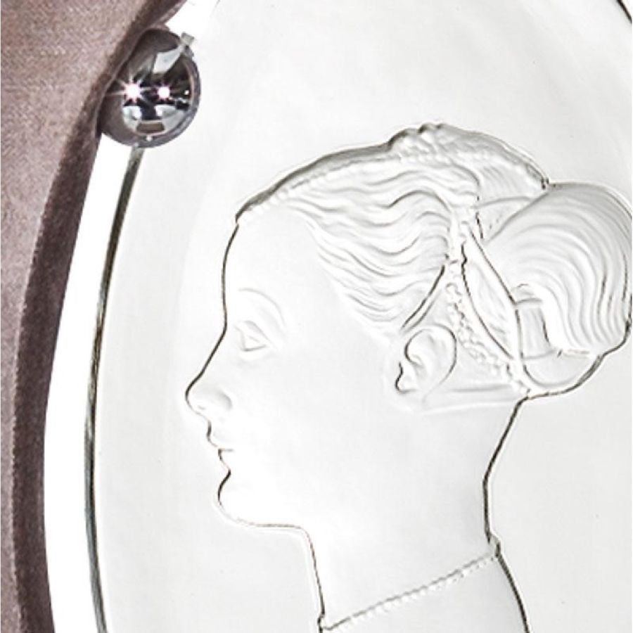 Oval-shaped “Cameo”, transparent cast glass decor with a depiction of a noble lady. Spherical screws made of brass with shiny chrome-plated finish.