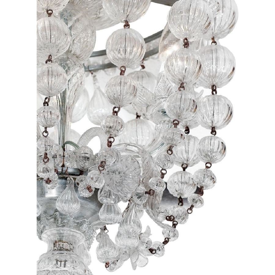 A decreasing size glass bead cascade, ending with a drop-shaped pendant. All glass elements are fixed with an iron wire as per the ancient Venetian chandelier tradition.