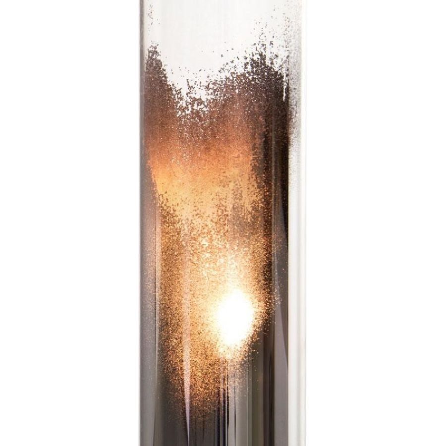 Metal structure with black coloured antiqued brass finish. Cylindrical-shaped glass lampshades, with medium antiqued mirrored finish on the bottom and transparent on the top, “Lagune” style. 10 lights.