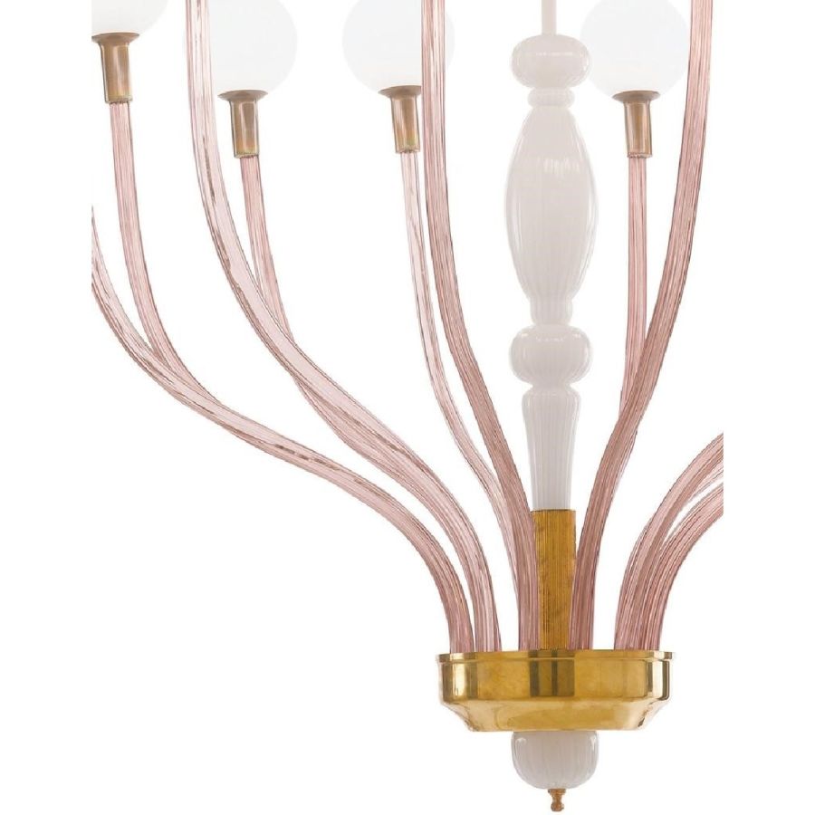 Art Déco chandelier with 12 lights in white and amethyst handmade glass. Structure in shiny brass.