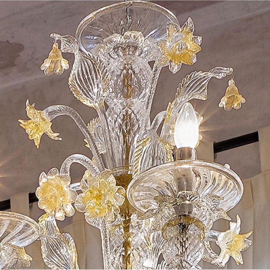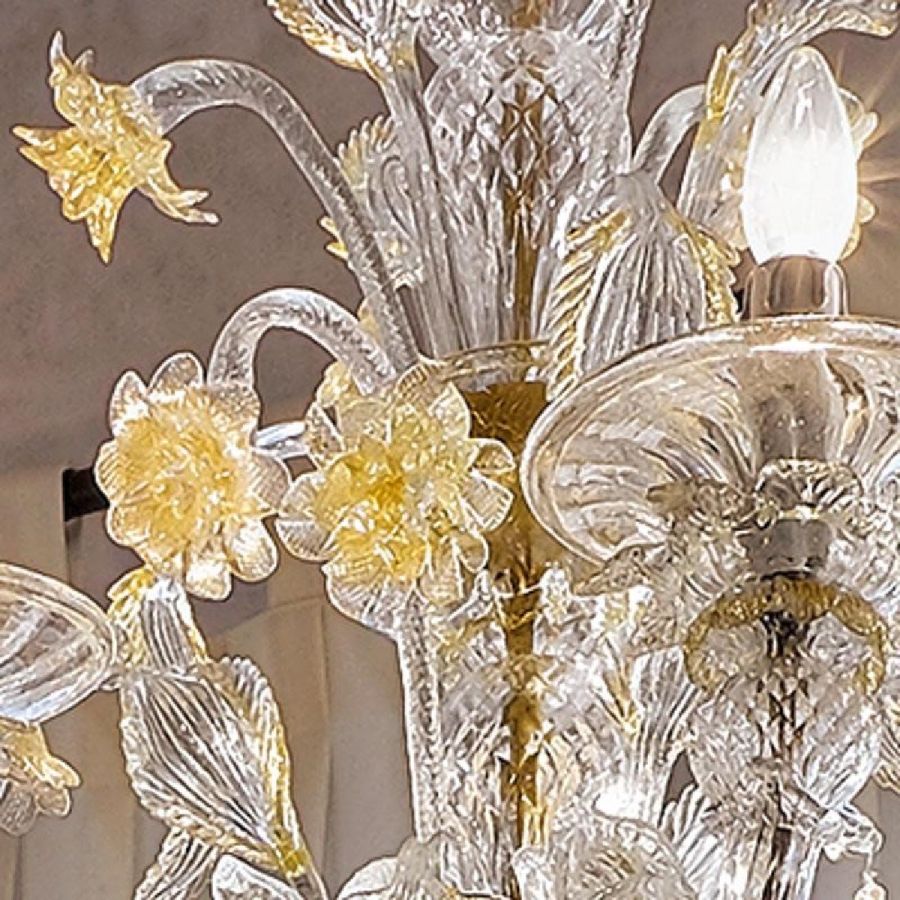 Metal structure with golden finish. Crystal and gold coloured Murano glass with 6 lights.