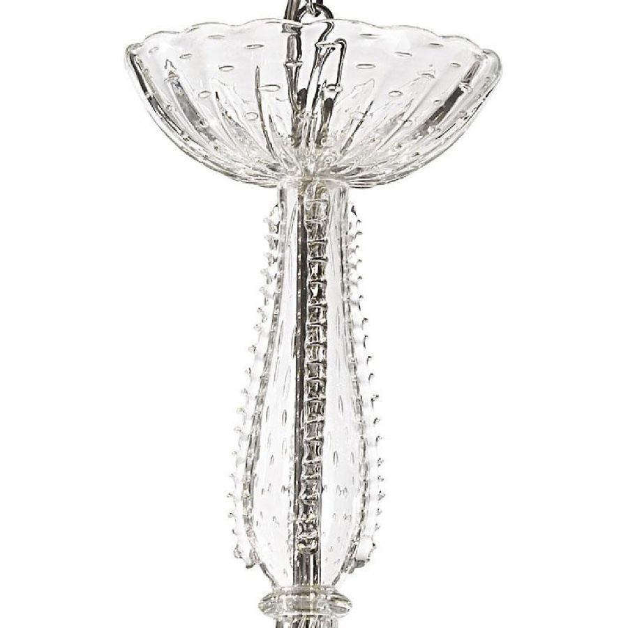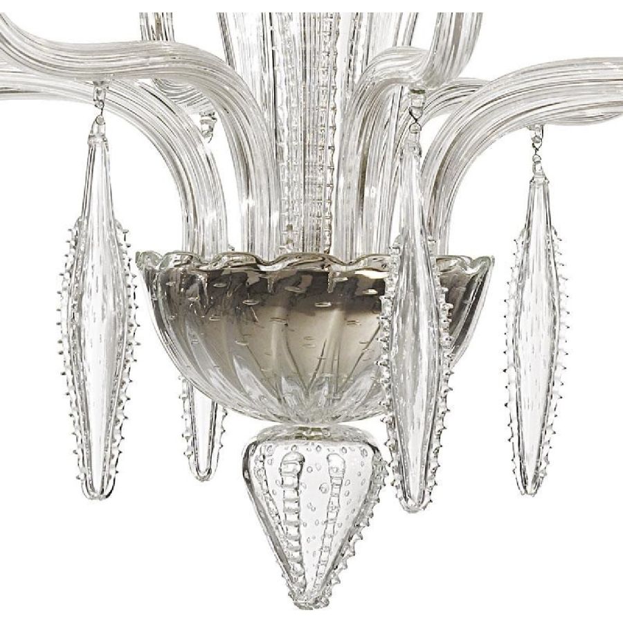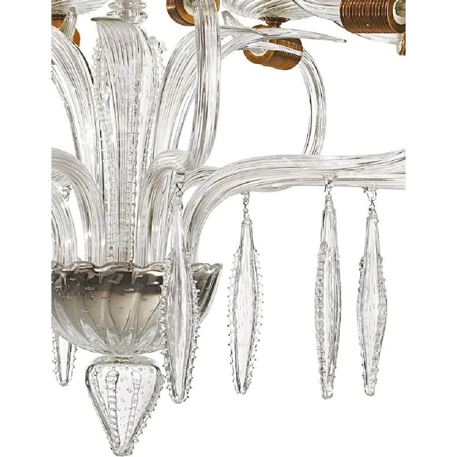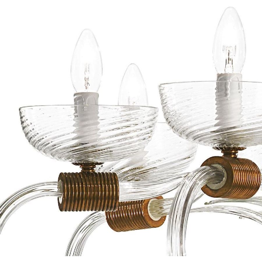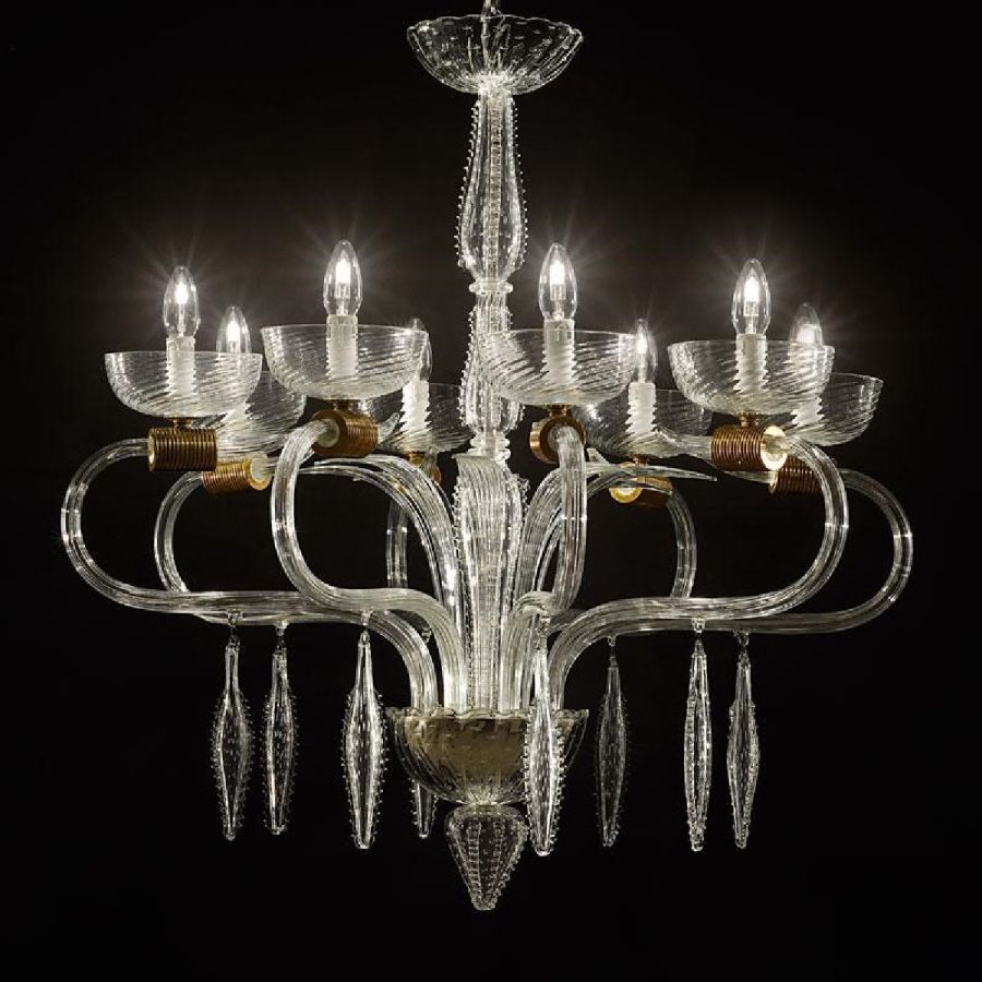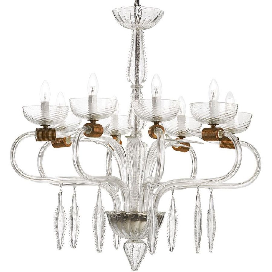 Metal structure with antiqued brass finish. Curved crystal coloured stiped Murano glass arms, cups and pendants with 8 lights.