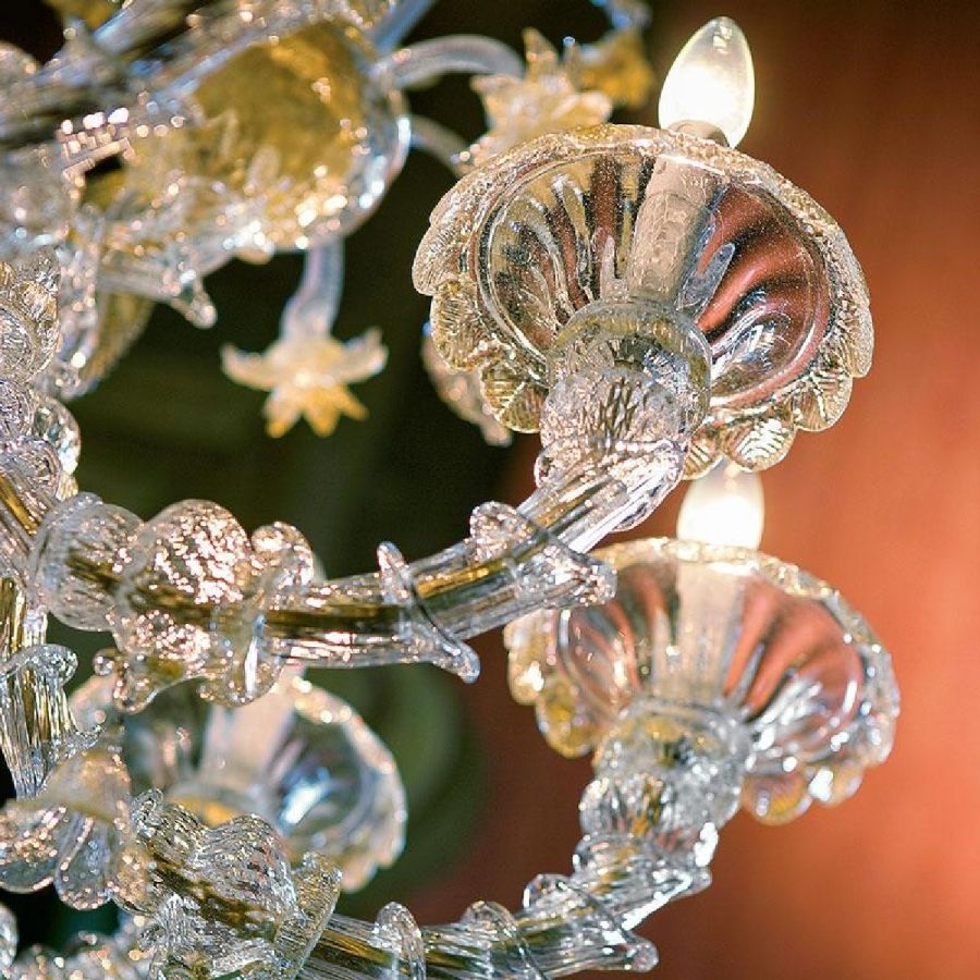Metal structure with golden finish. Crystal and gold coloured Murano glass with 12 lights.