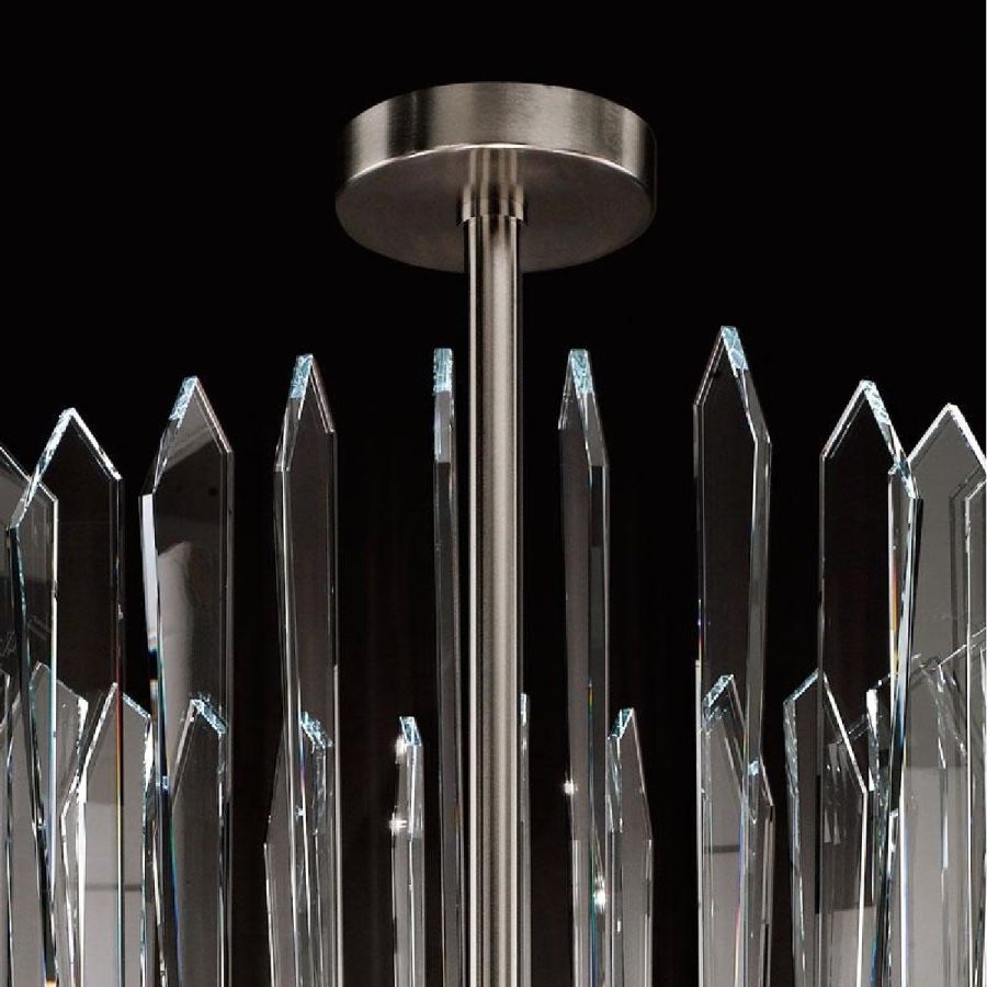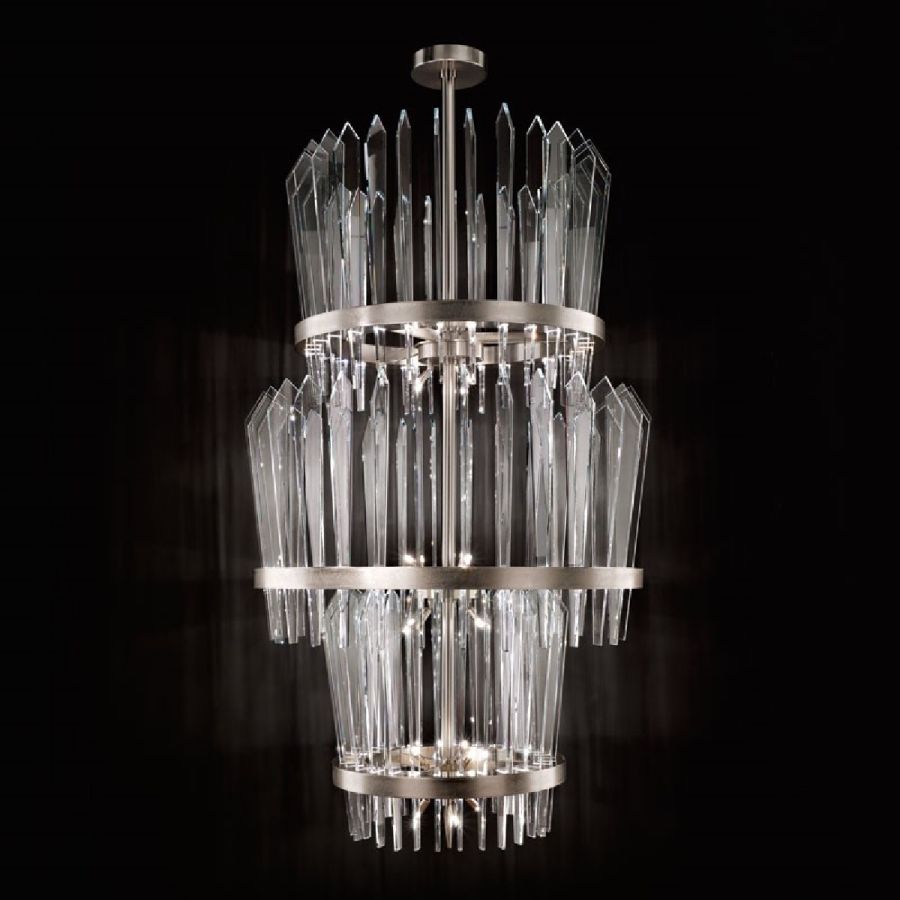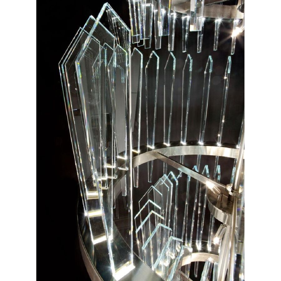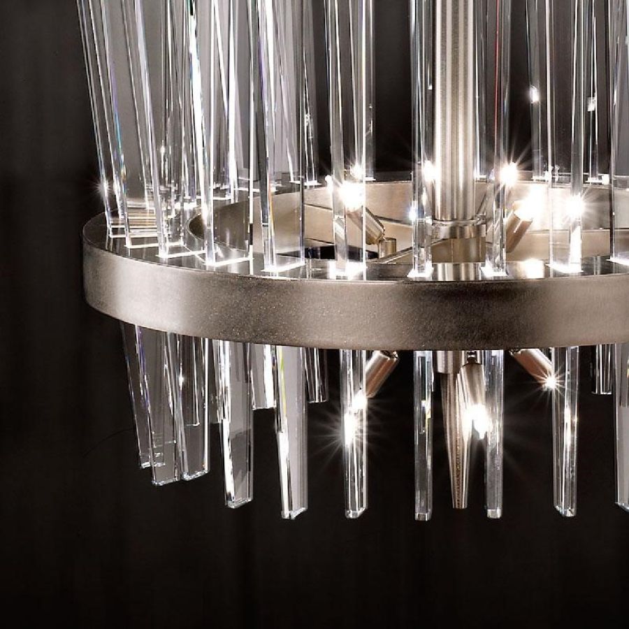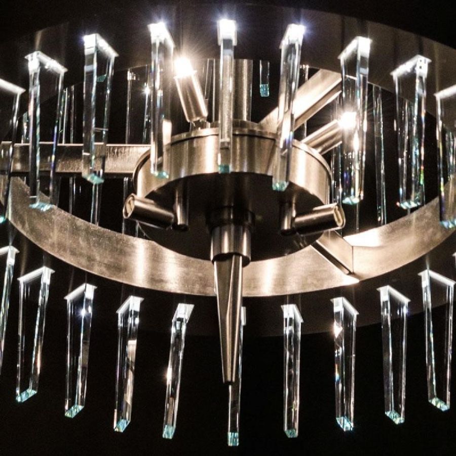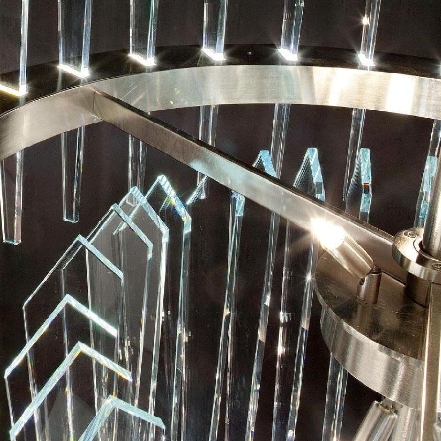 Structure made of brass with satin nickel finish. Hand bevelled extra-clear glass beams. LED lighting.