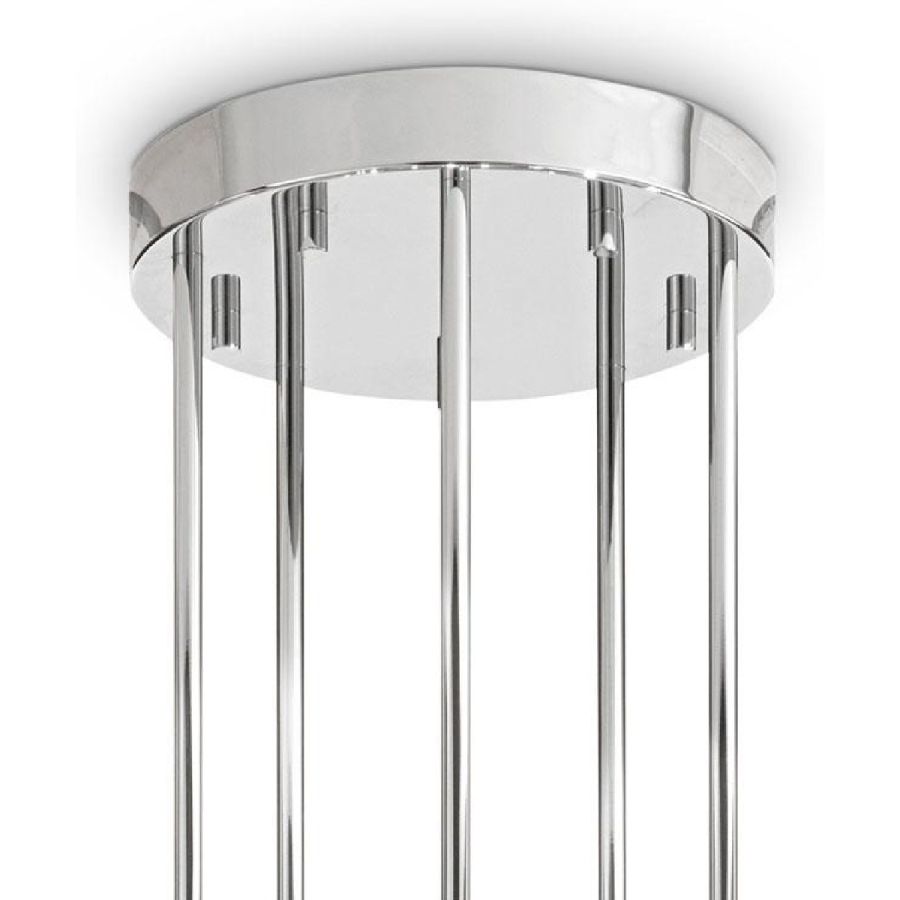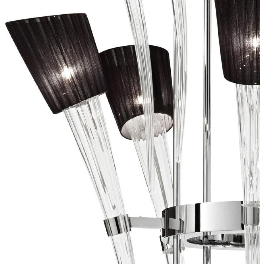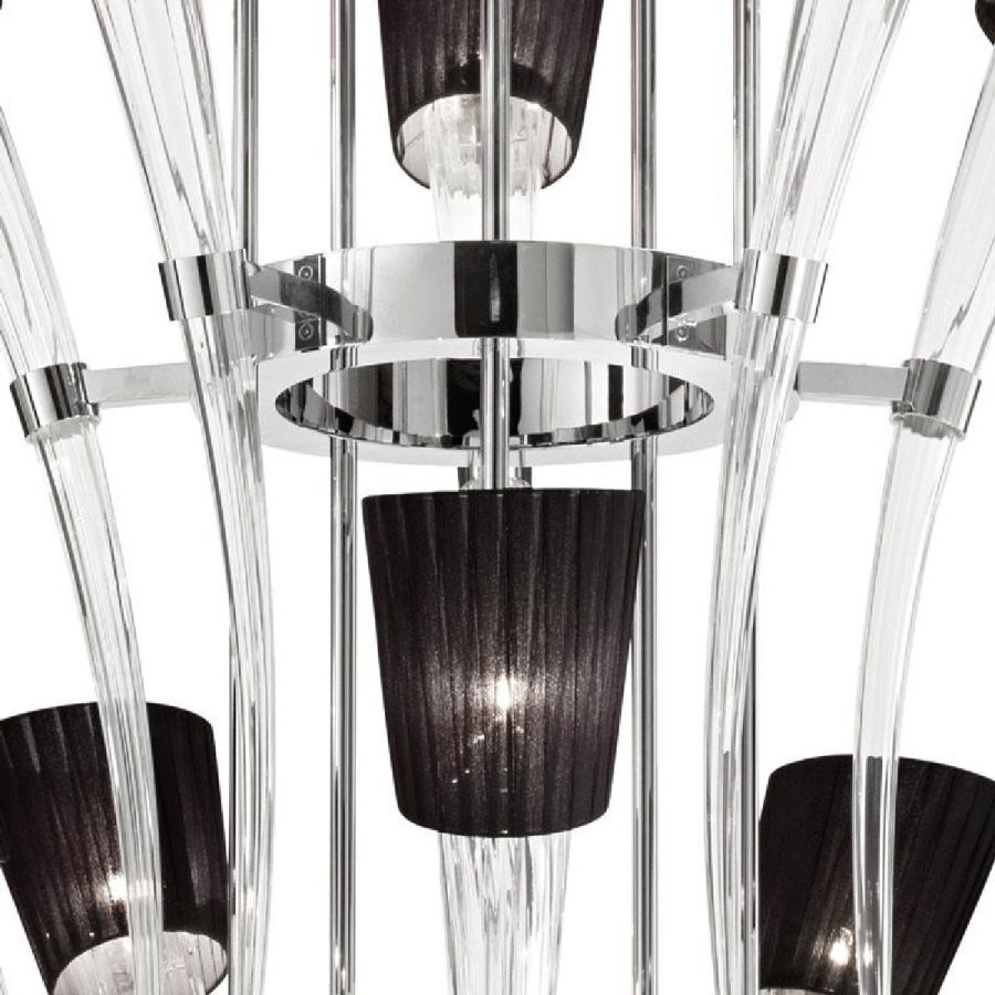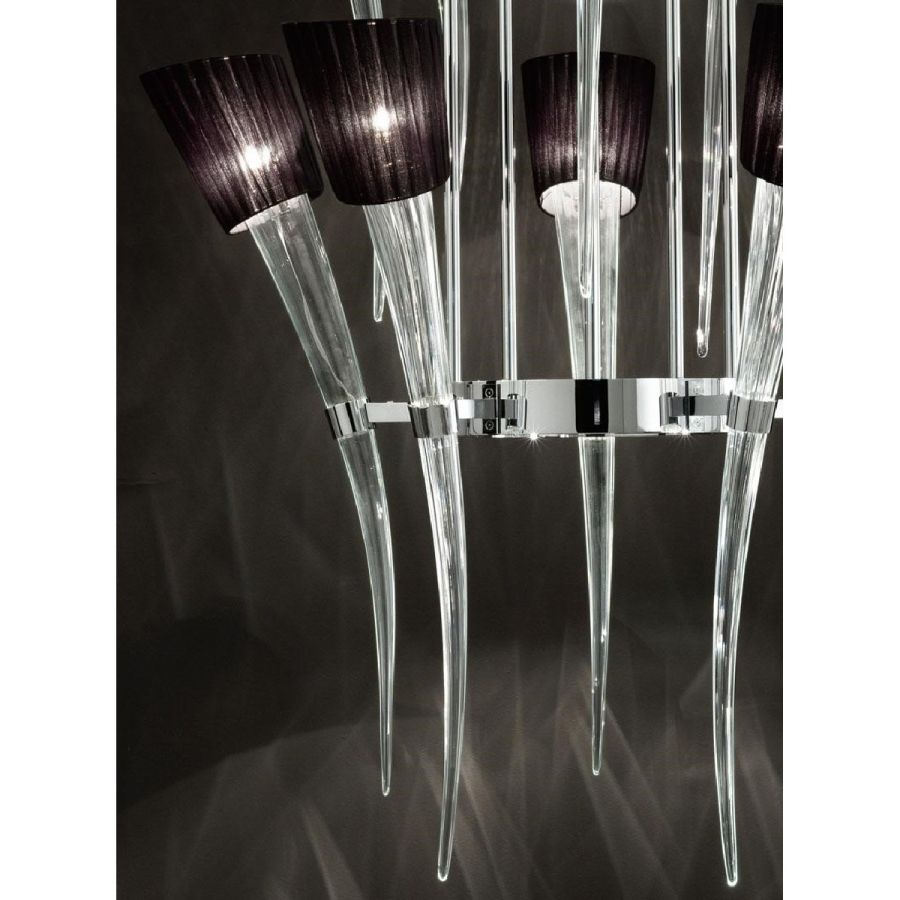 Cylindrical metal structure with shiny chrome finish. Conic-shaped and curved crystal coloured striped Murano glass arms.
