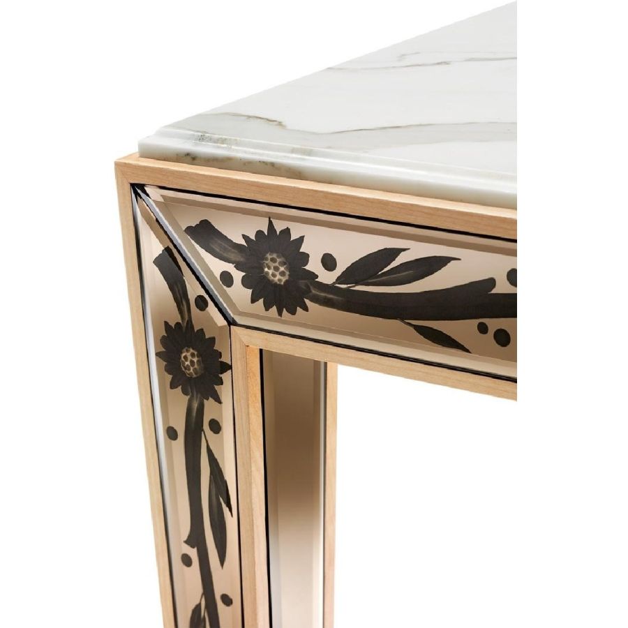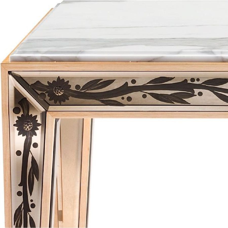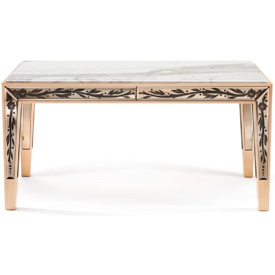 Top made of white Calacatta marble. Frames and legs made of bronze glass with clear mirrored finish.