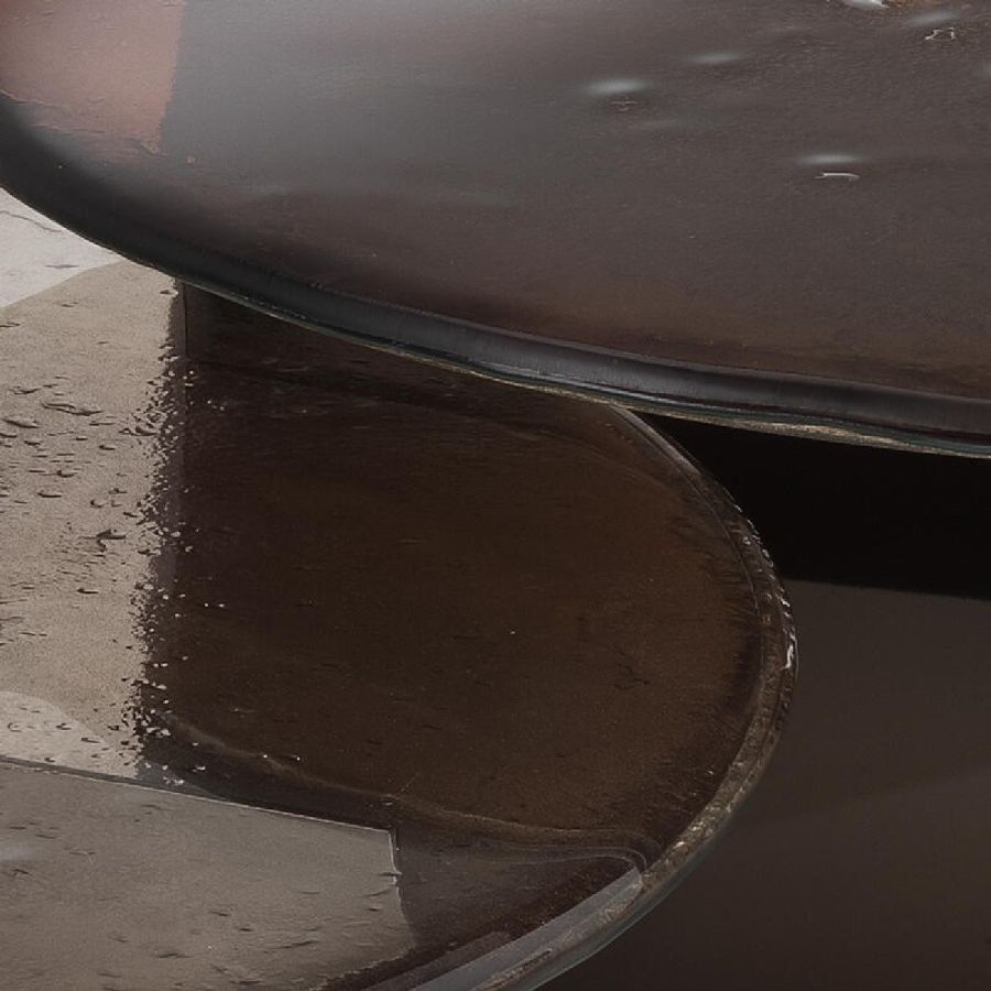Top in baked glass in two layers with irregular edges, painted degradé from bronze to transparent, with partial silvering on the back.