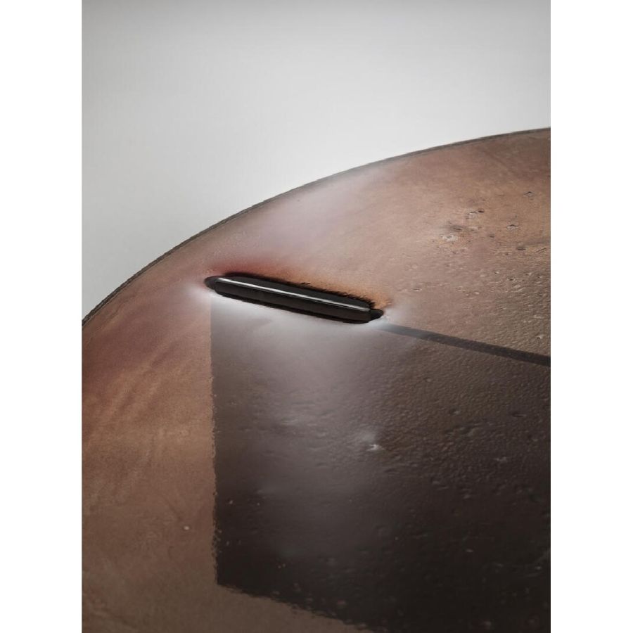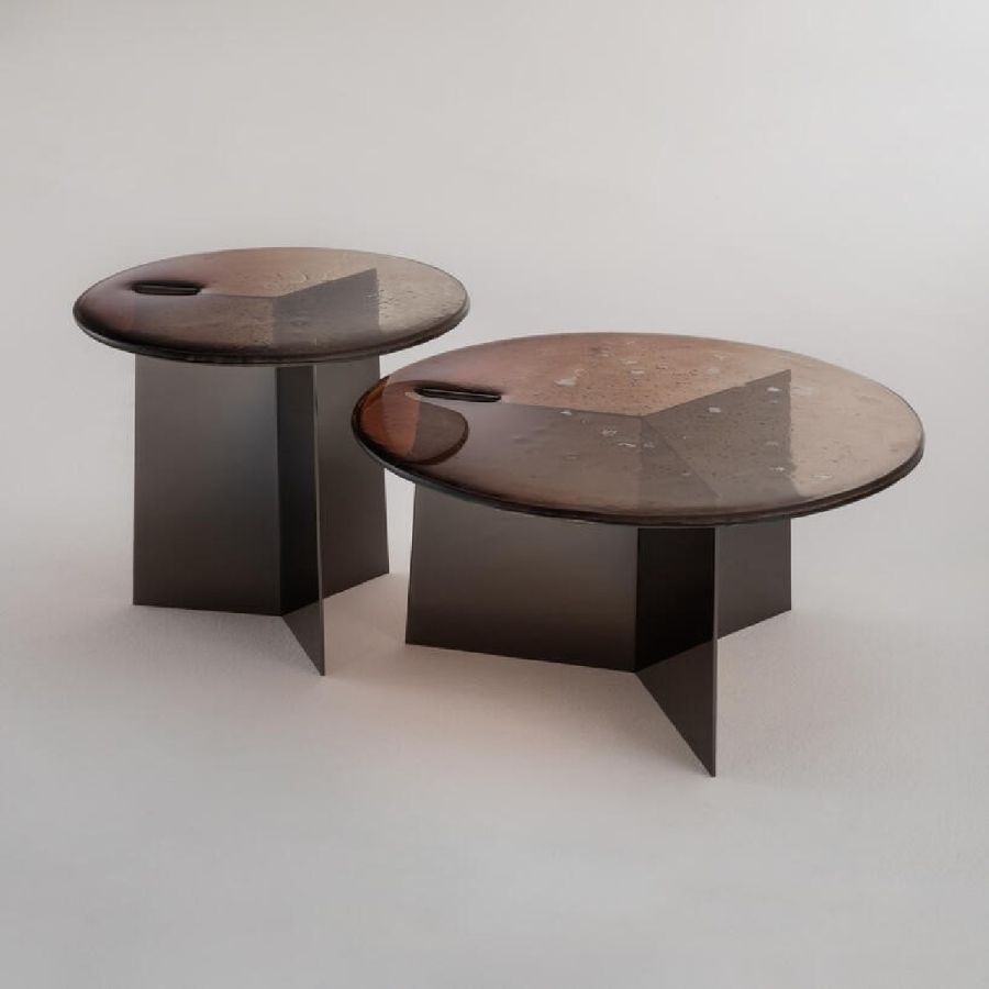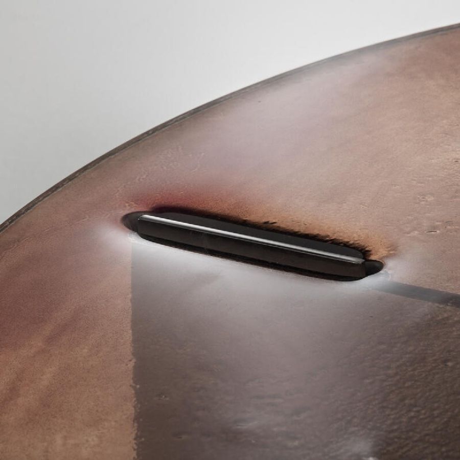 Top in baked glass in two layers with irregular edges, painted degradé from bronze to transparent, with partial silvering on the back.