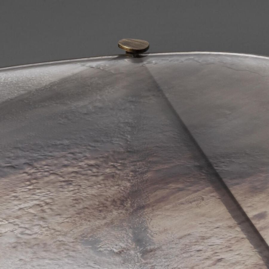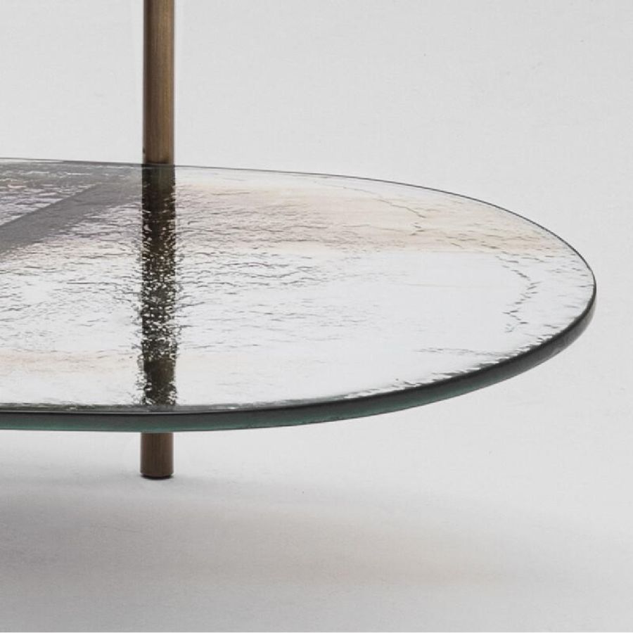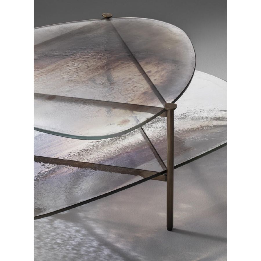 Metal structure with brushed burnished brass finish. Top in 12 mm thick glass on two levels with Barbaresco finish.