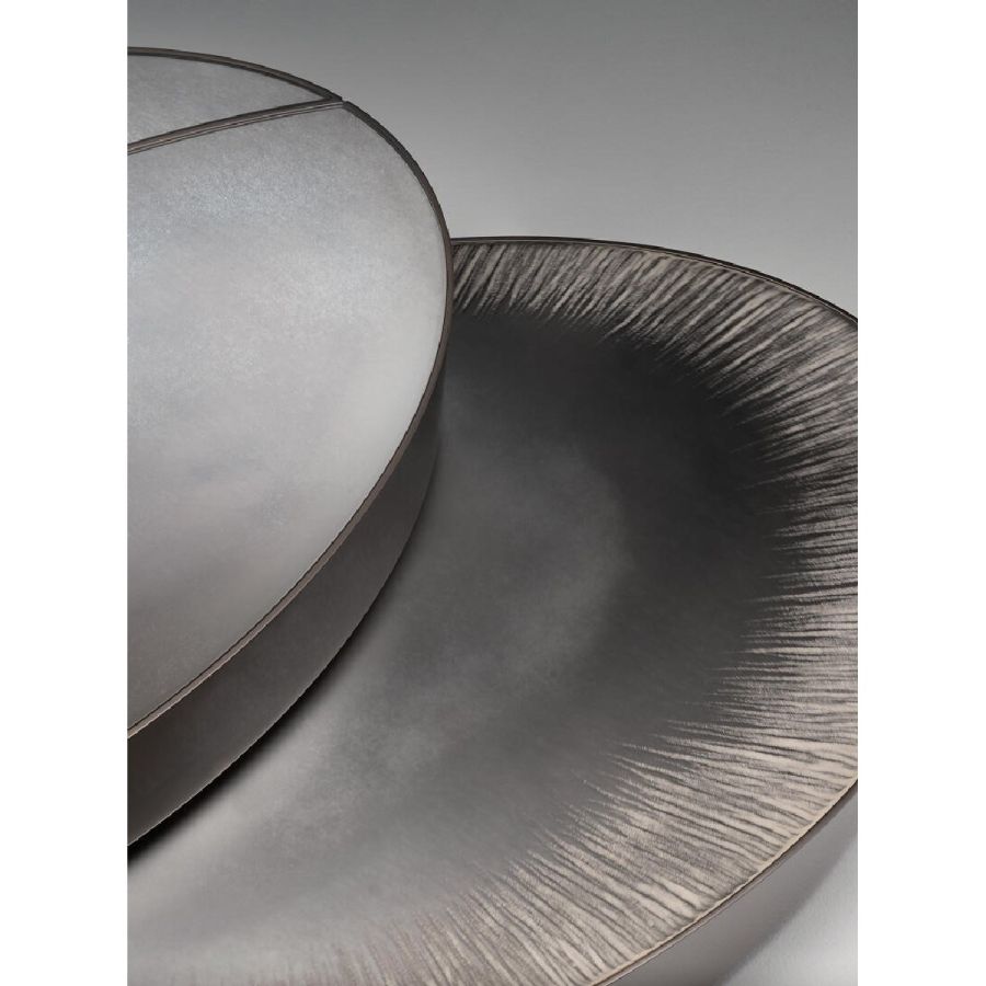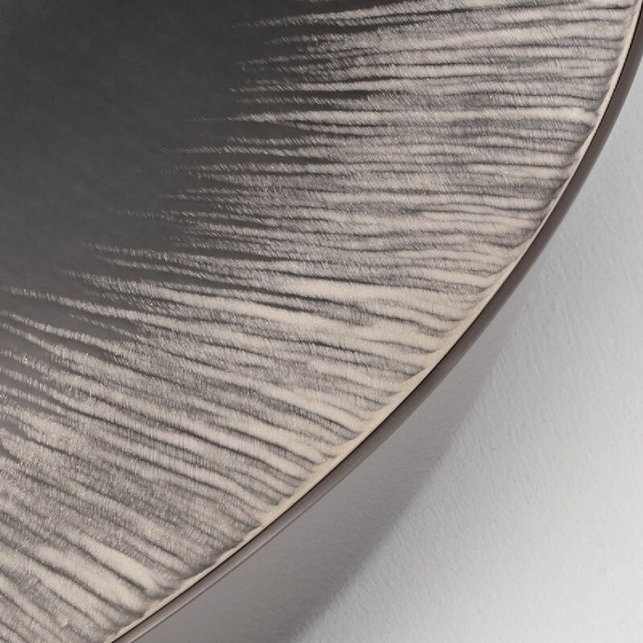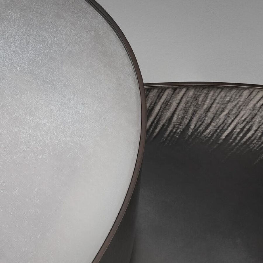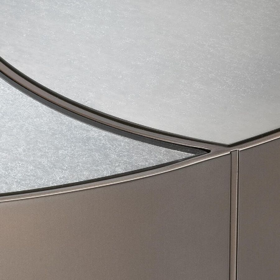 Lower top made in extra-clear acid-etched glass, 6 mm thick, hand engraved with finish and hand silvered with fading effect.