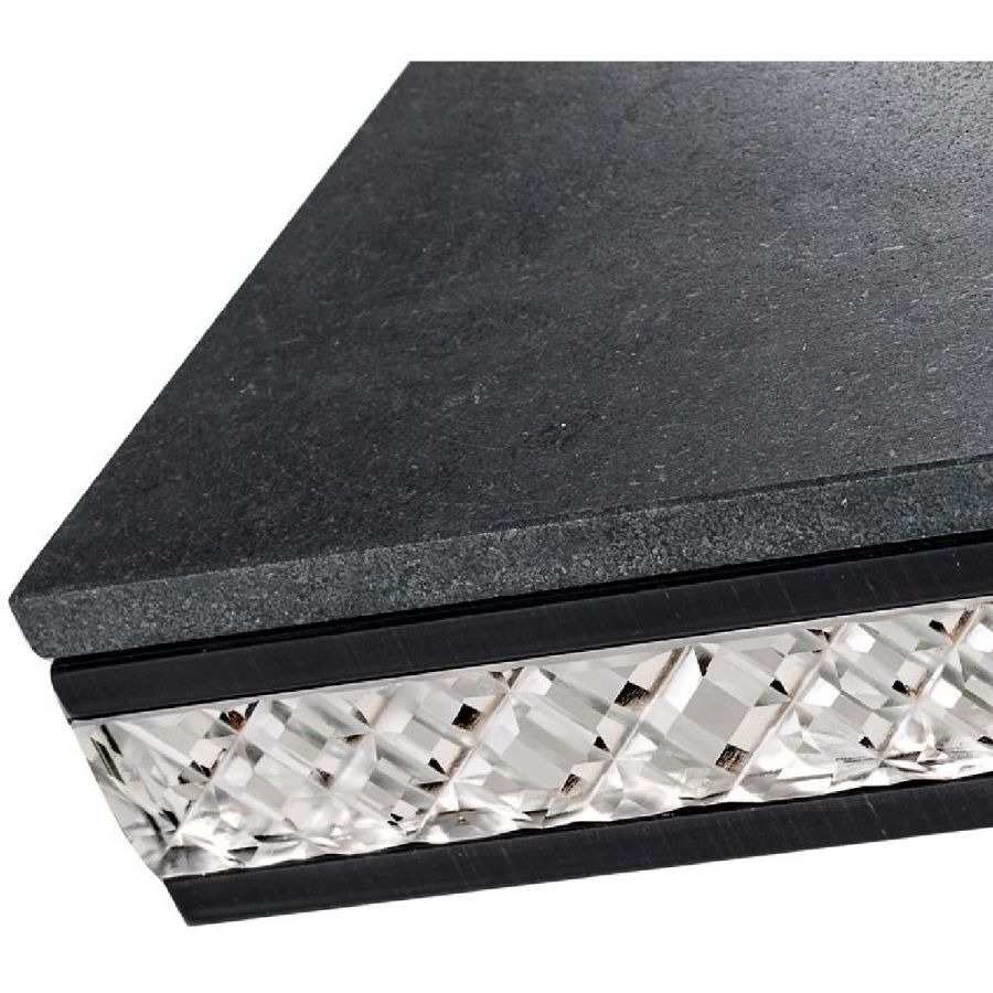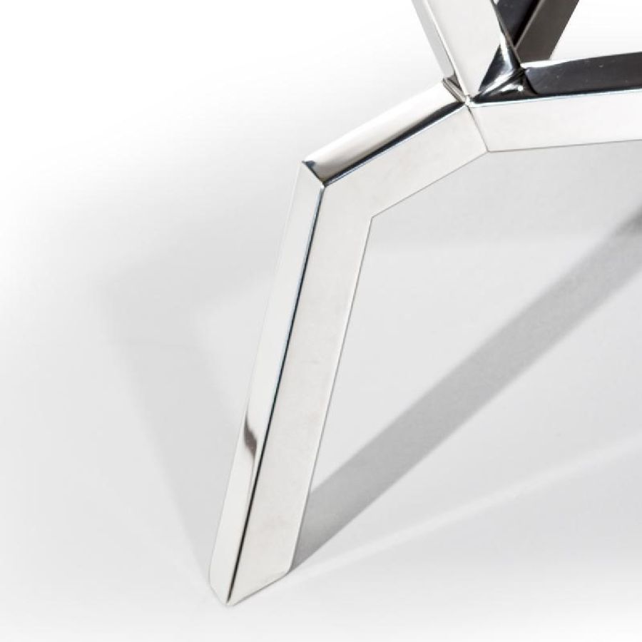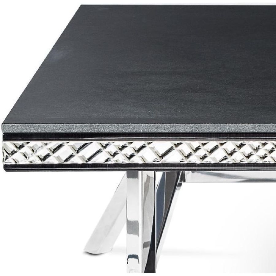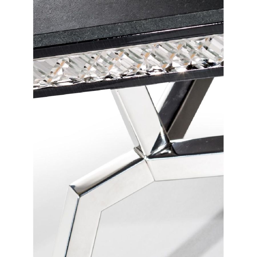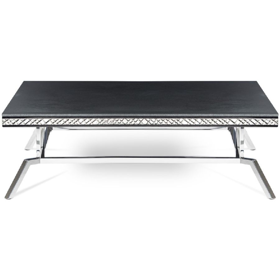 Coffee table with top in antiqued Black Absolute marble and inserts in extraclear mirror with handmade shiny bevellings. Base in shiny stainless steel.