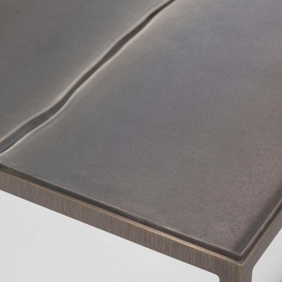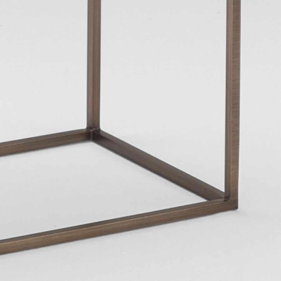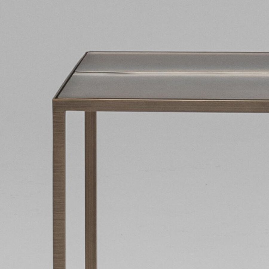 Metal frame with brushed burnished brass finish. Top in 10 mm thick glass inserts decorated with silver casting.