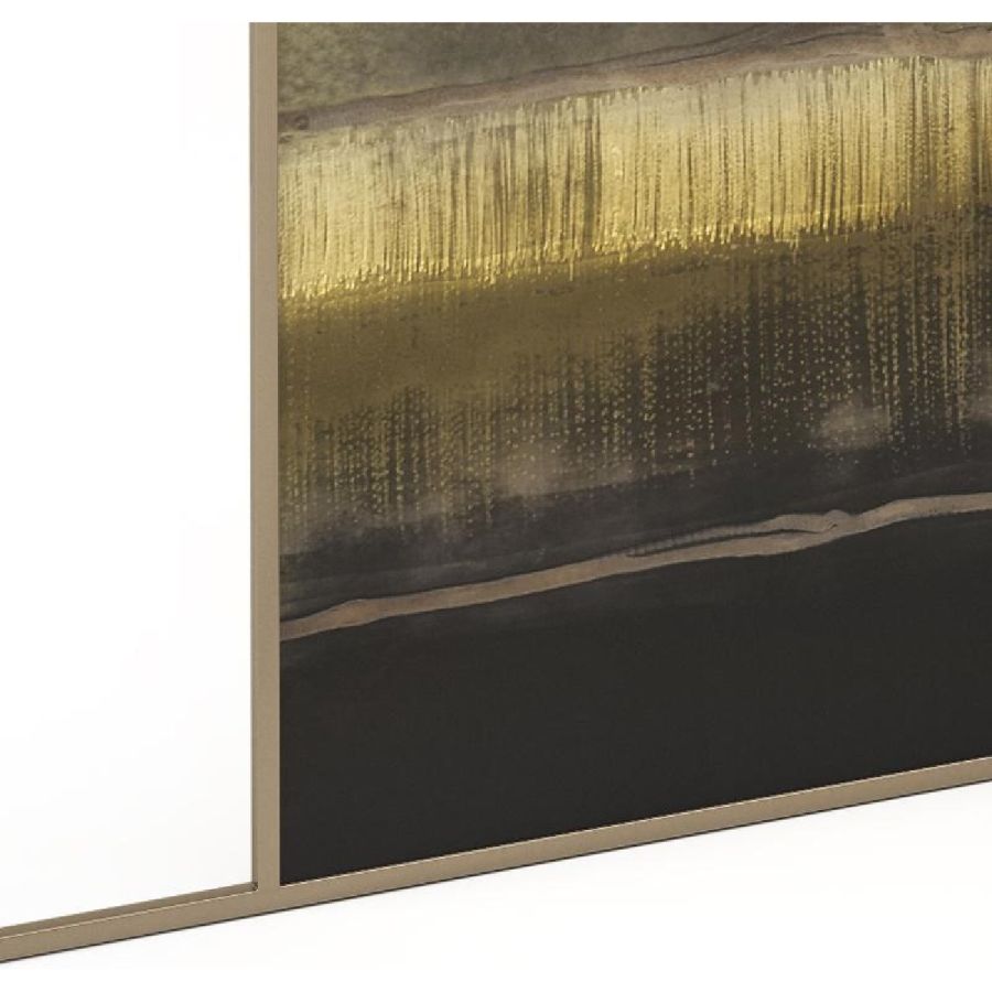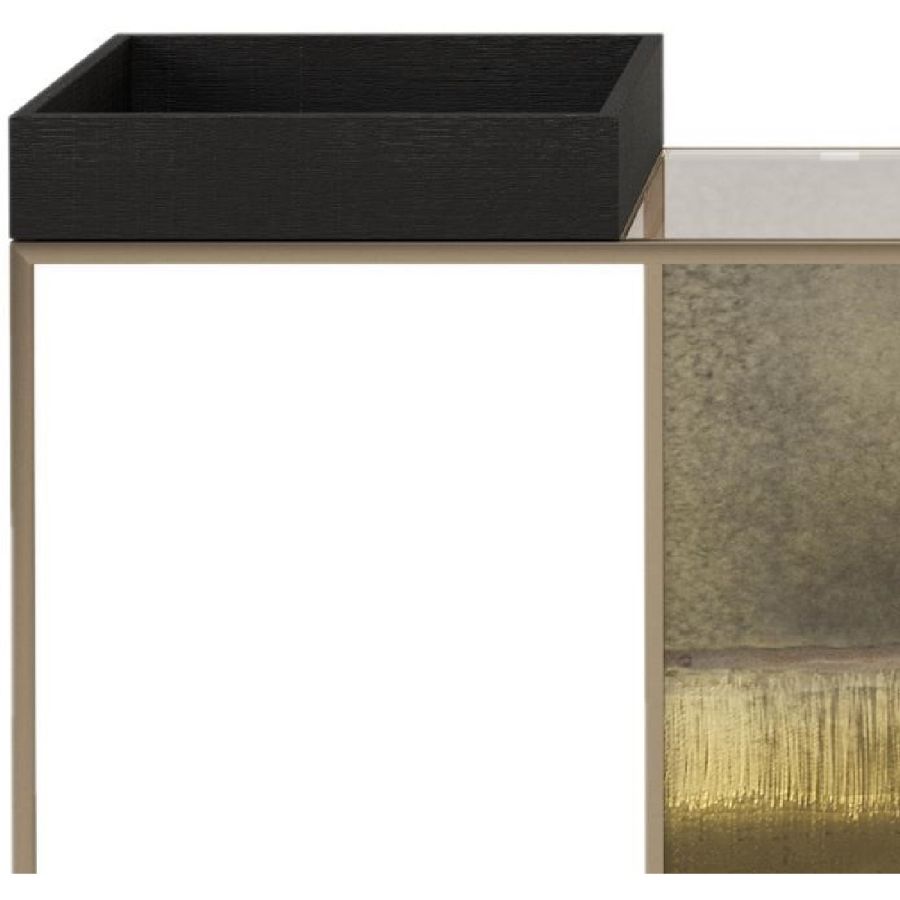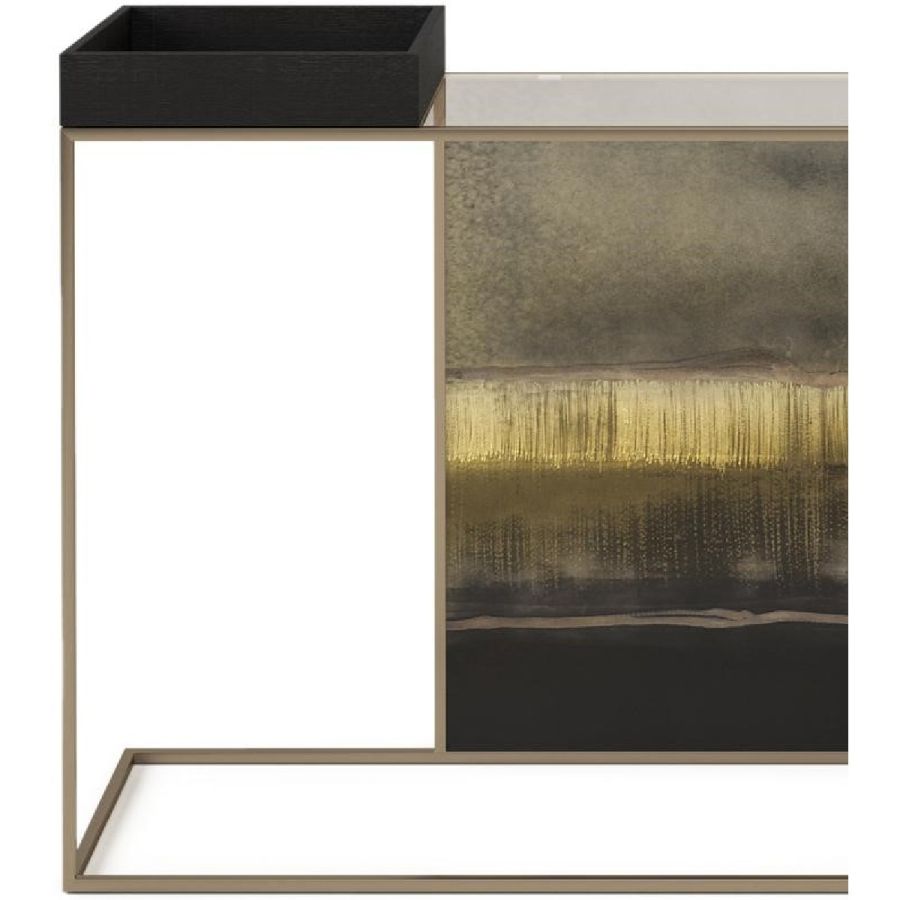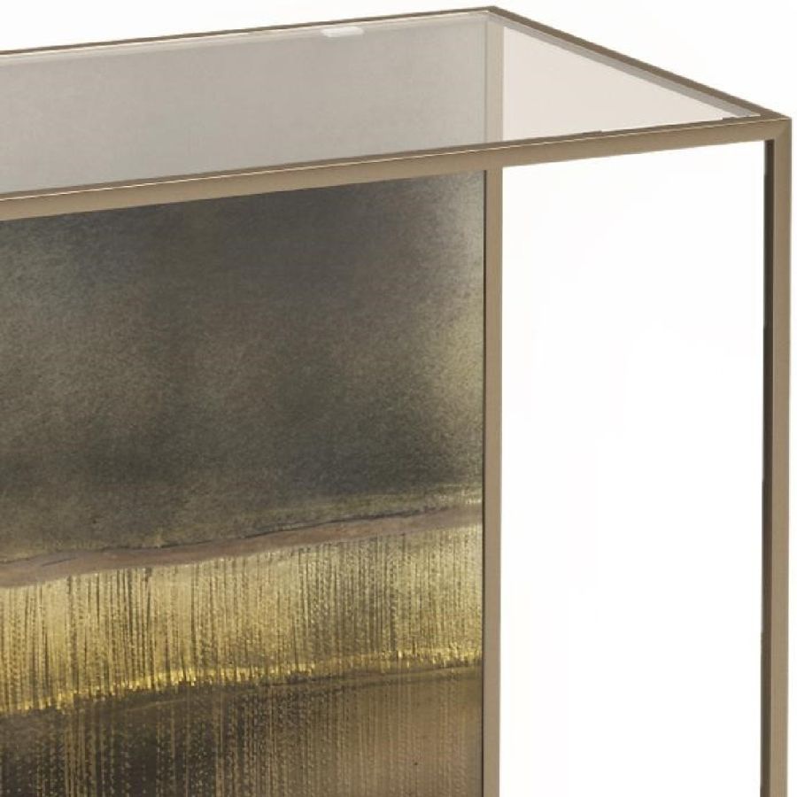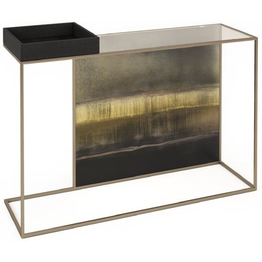 Console with metal frame in burnished brass finish. Back in extra-clear acid-etched glass decorated with Lipari decor.