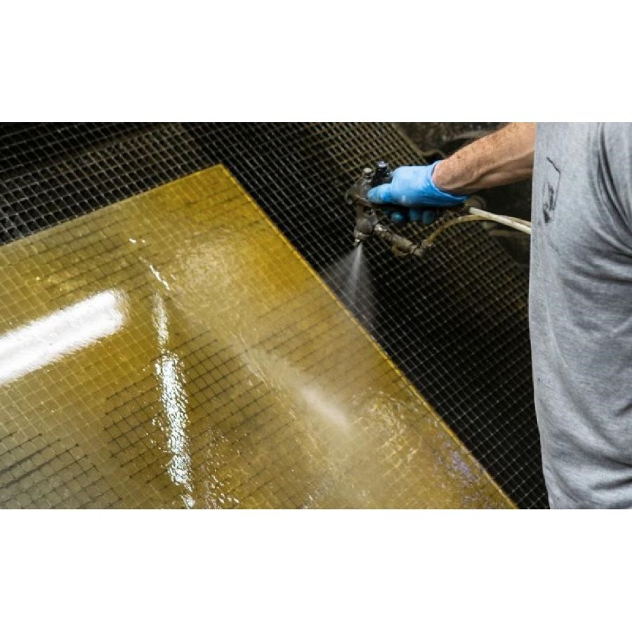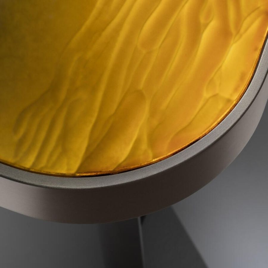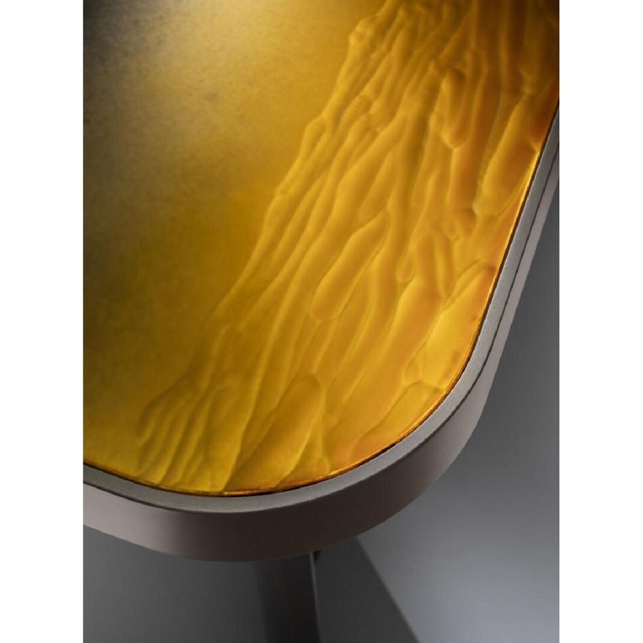 Top in Gargano finish on etched glass. Legs and outer edge made of wood lacquered in brass colour.