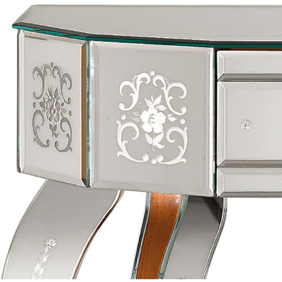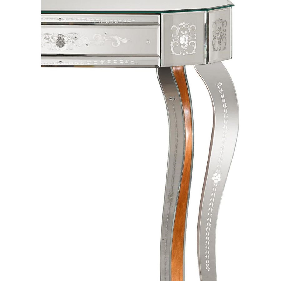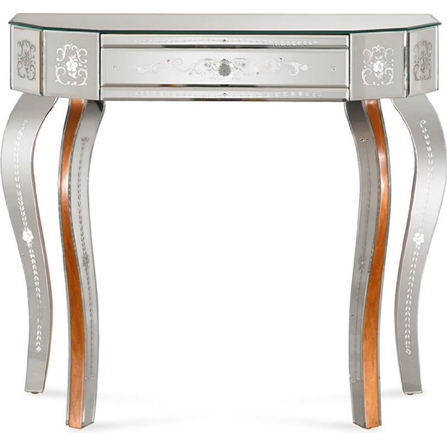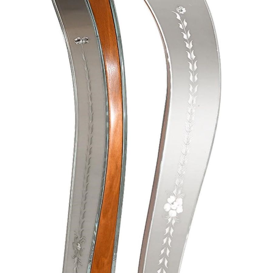 Structure made of wood with walnut coloured finish. Four flared legs. Top made of bevelled glass with clear mirrored finish. Front, sides and legs made of bevelled and engraved glass with clear mirrored finish.