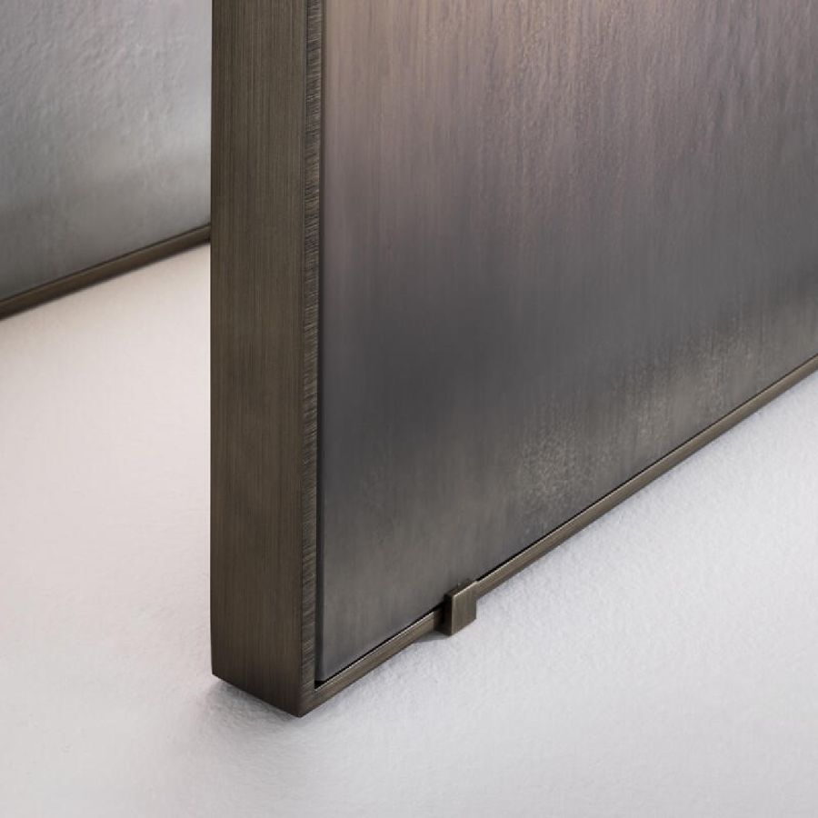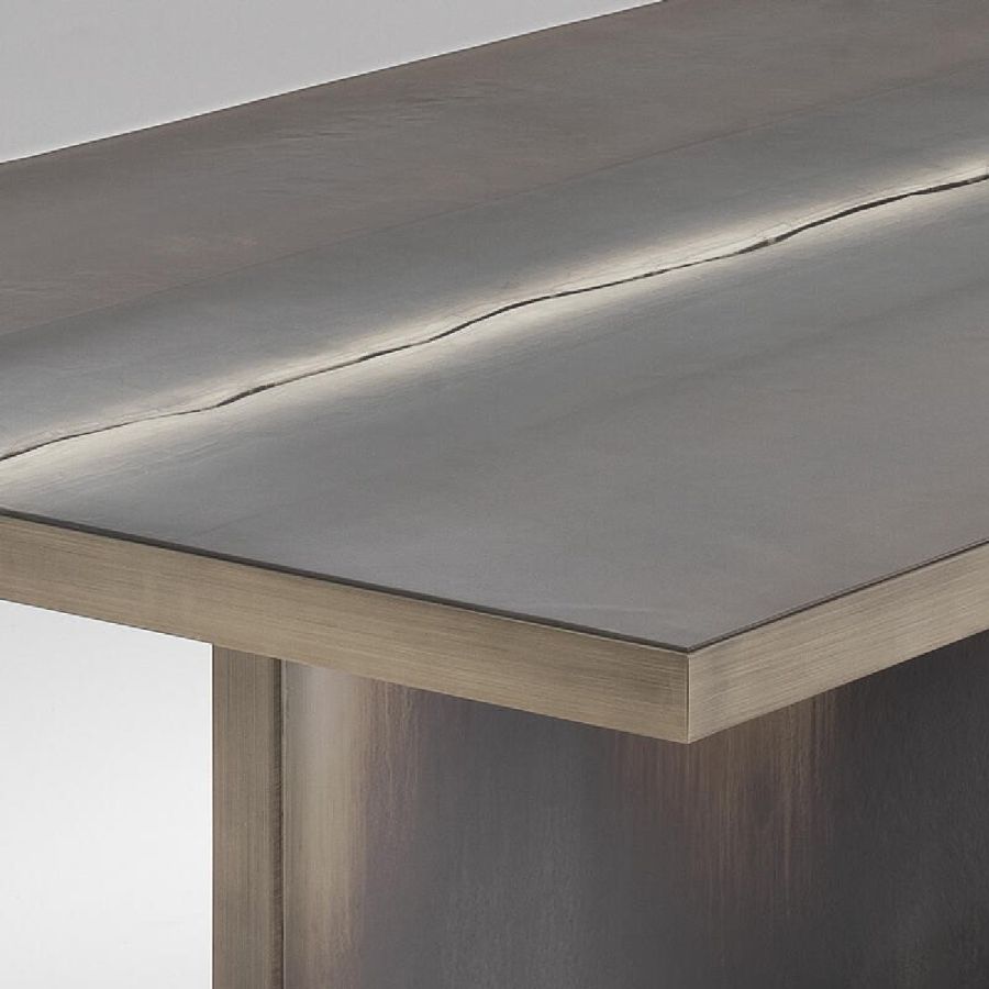 Metal structure with brushed burnished brass finish. 10 mm thick glass top divided into two parts decorated with Roddi finish.
