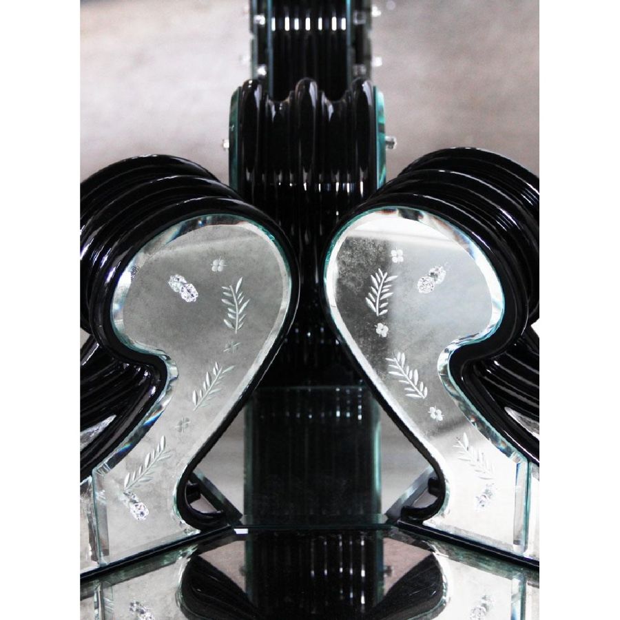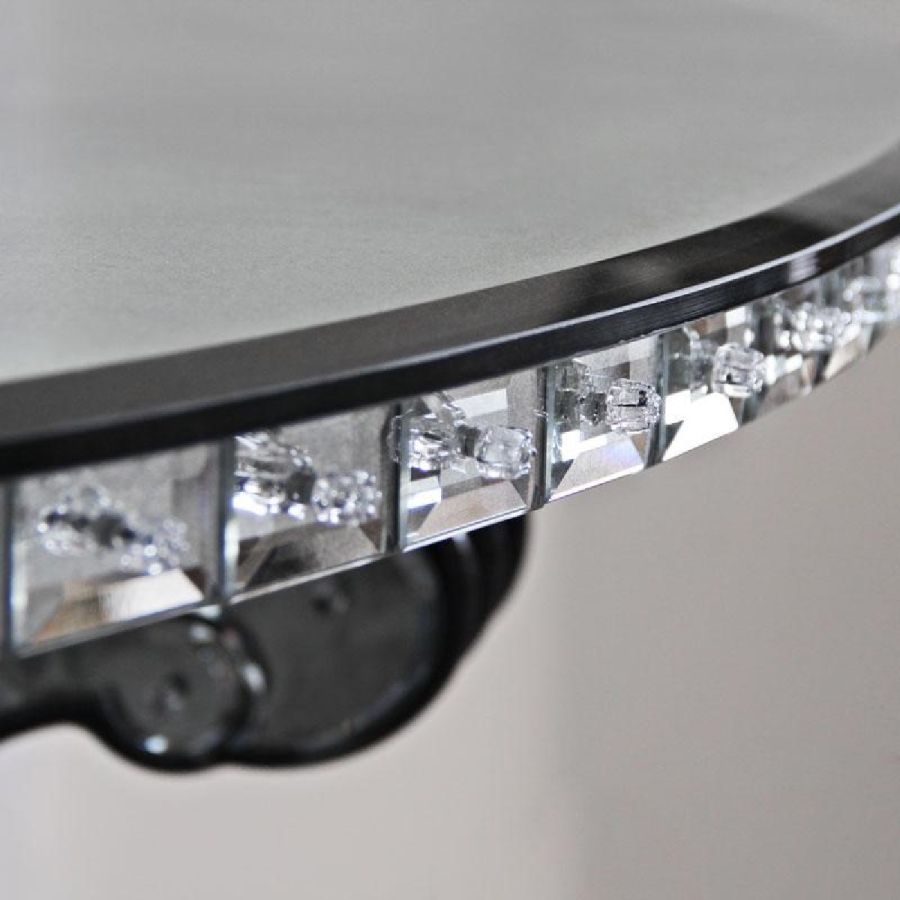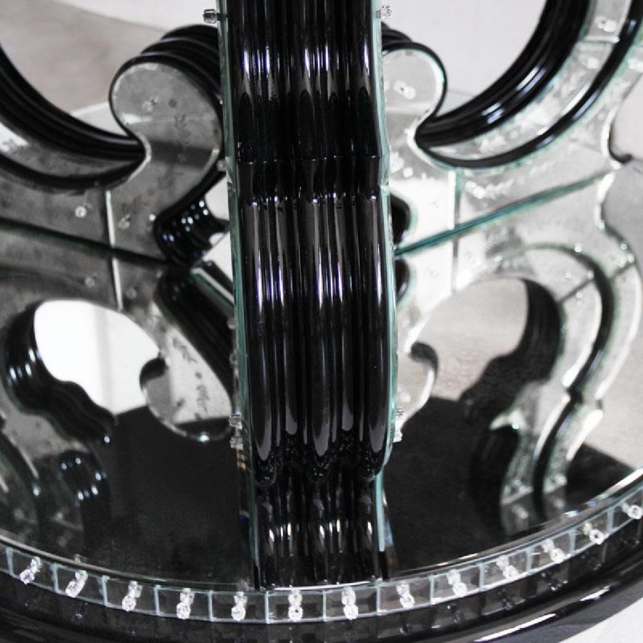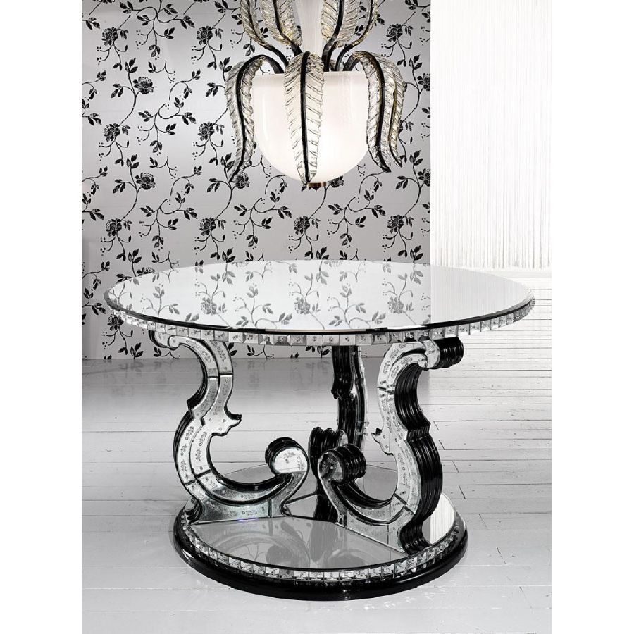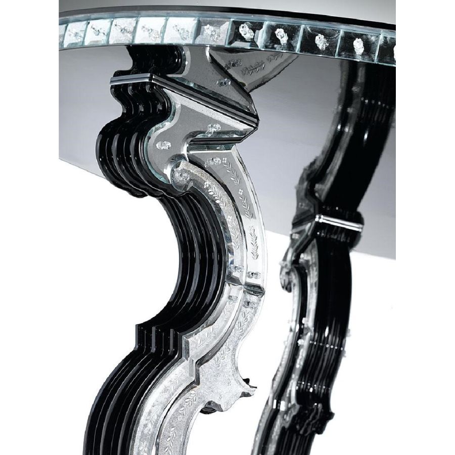 Round top made of bevelled glass with medium antique mirrored finish. Frames and legs made of bevelled and engraved glass tiles with medium antique mirrored finish.