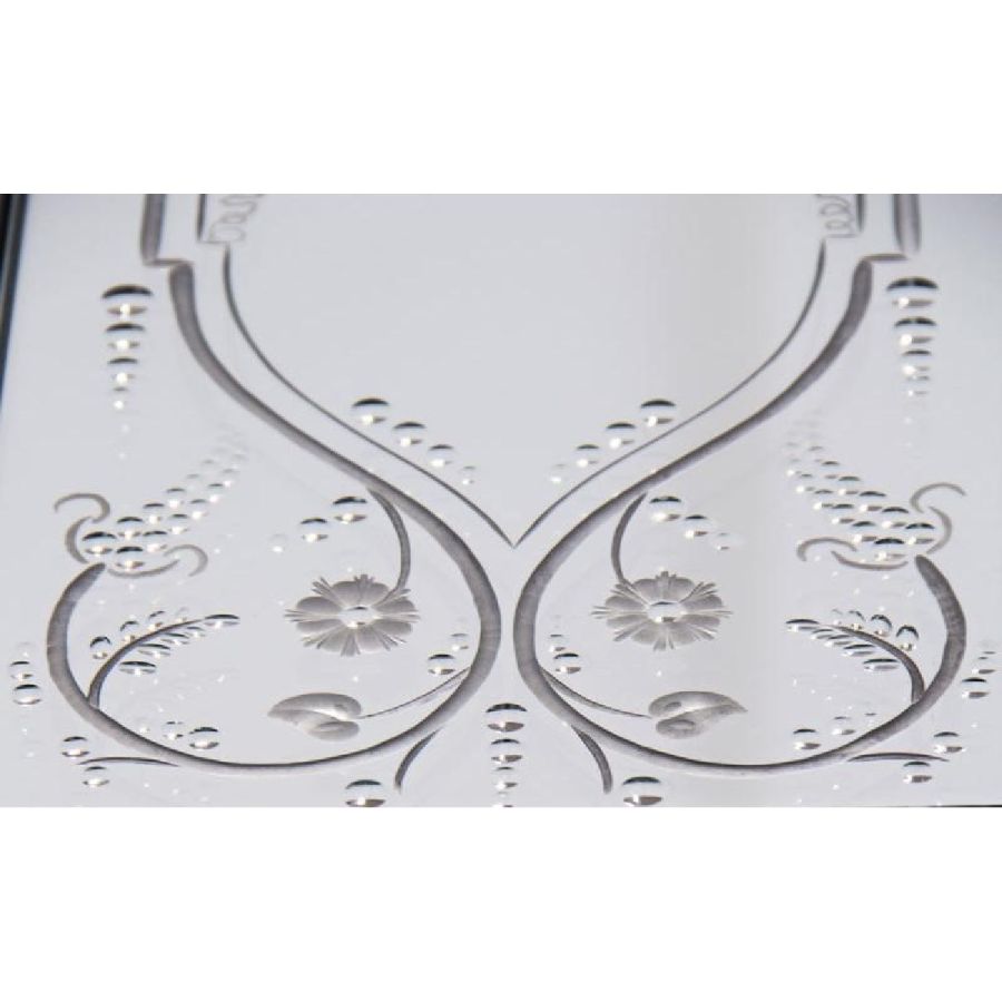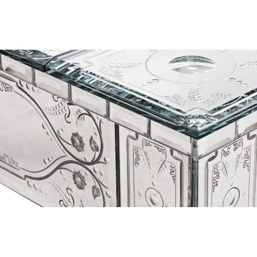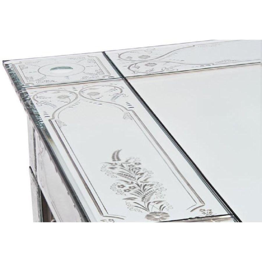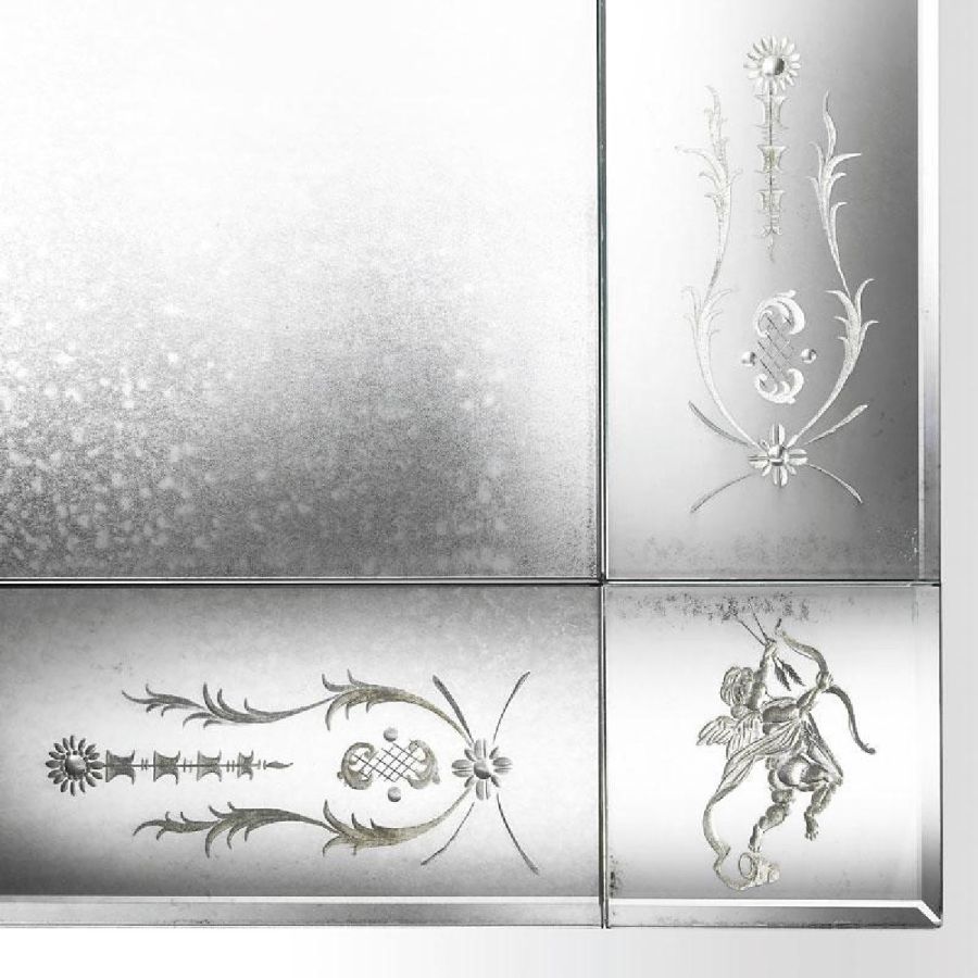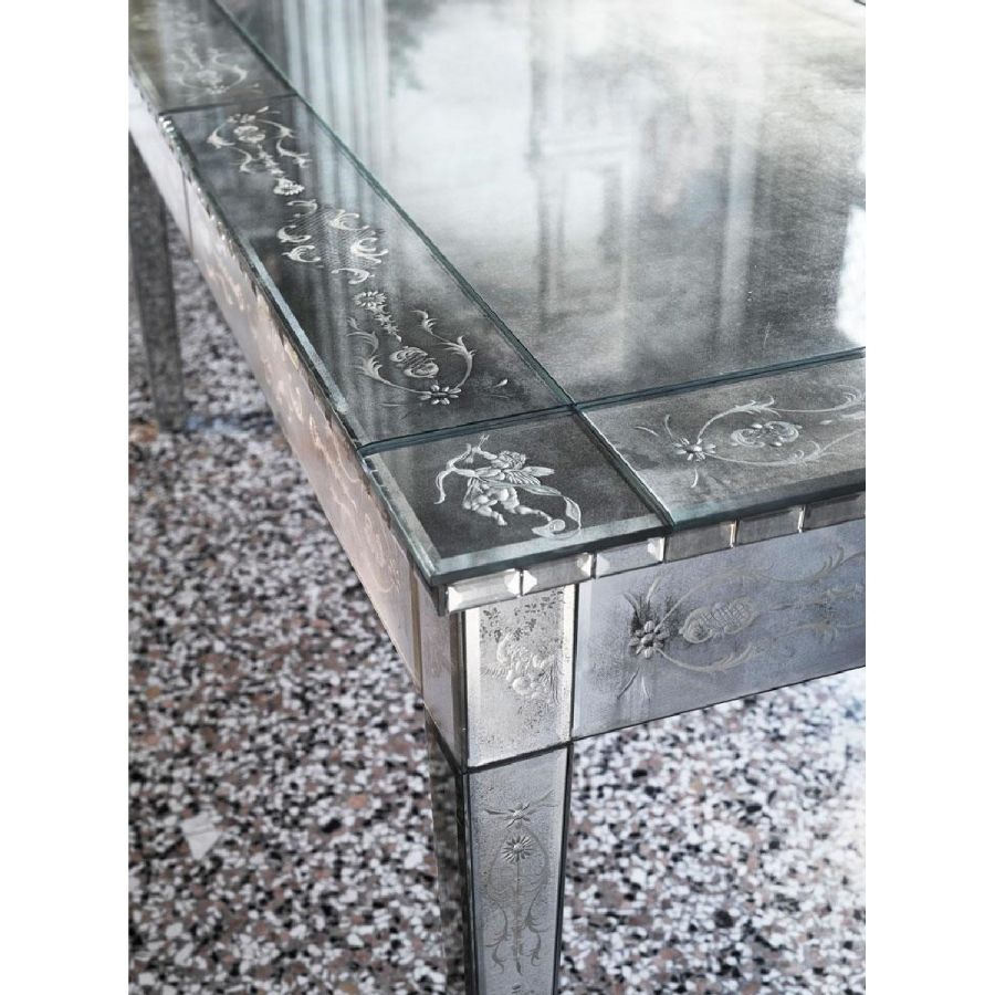 Central part of the top made of medium antique mirrored glass. Frames made of bevelled and engraved glass with medium antique mirrored finish.