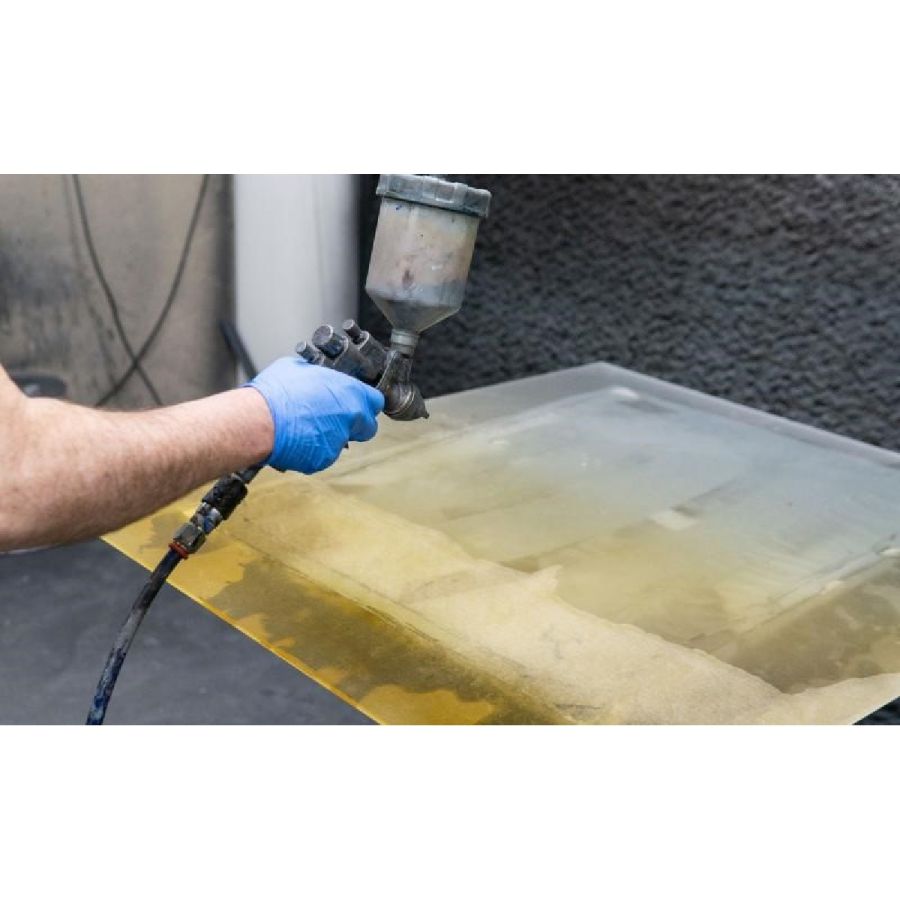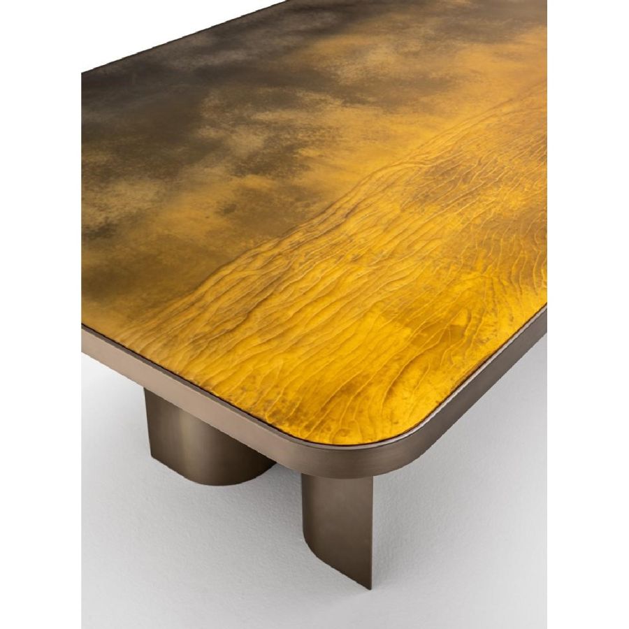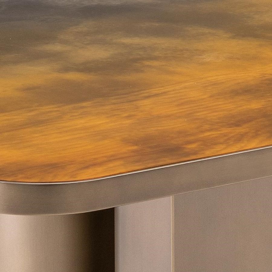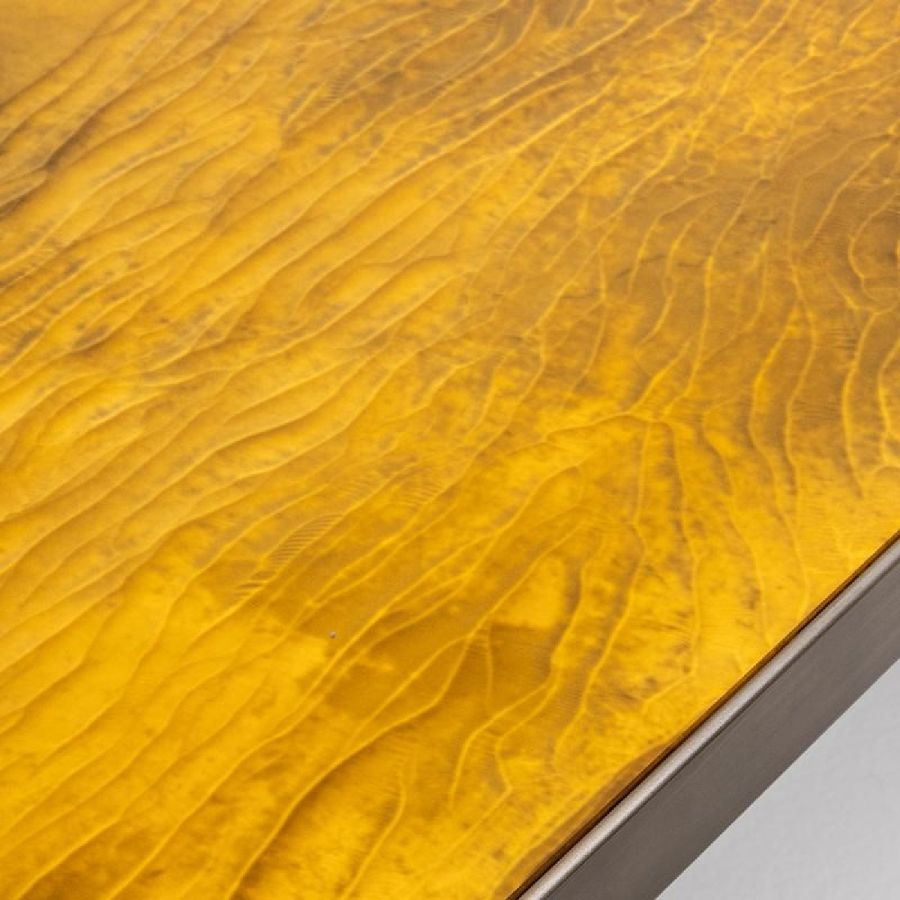 Top in Gargano finish on etched glass. Outer edge in wood varnished with burnished brass finish, legs in burnished brass.