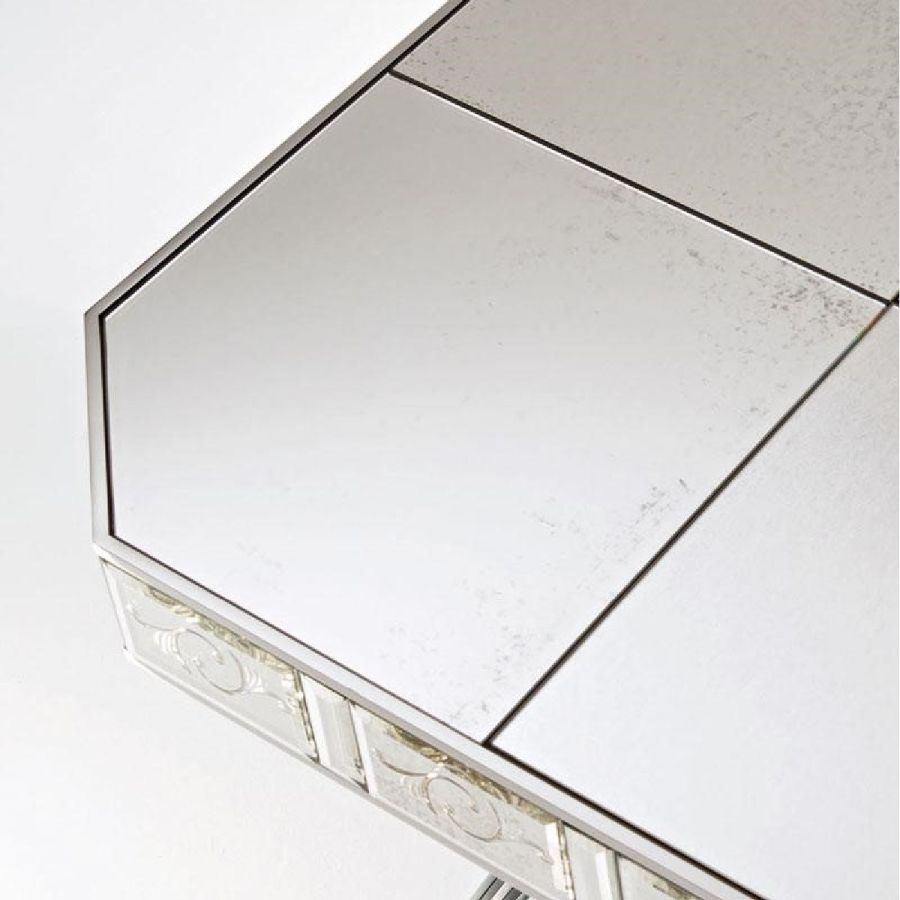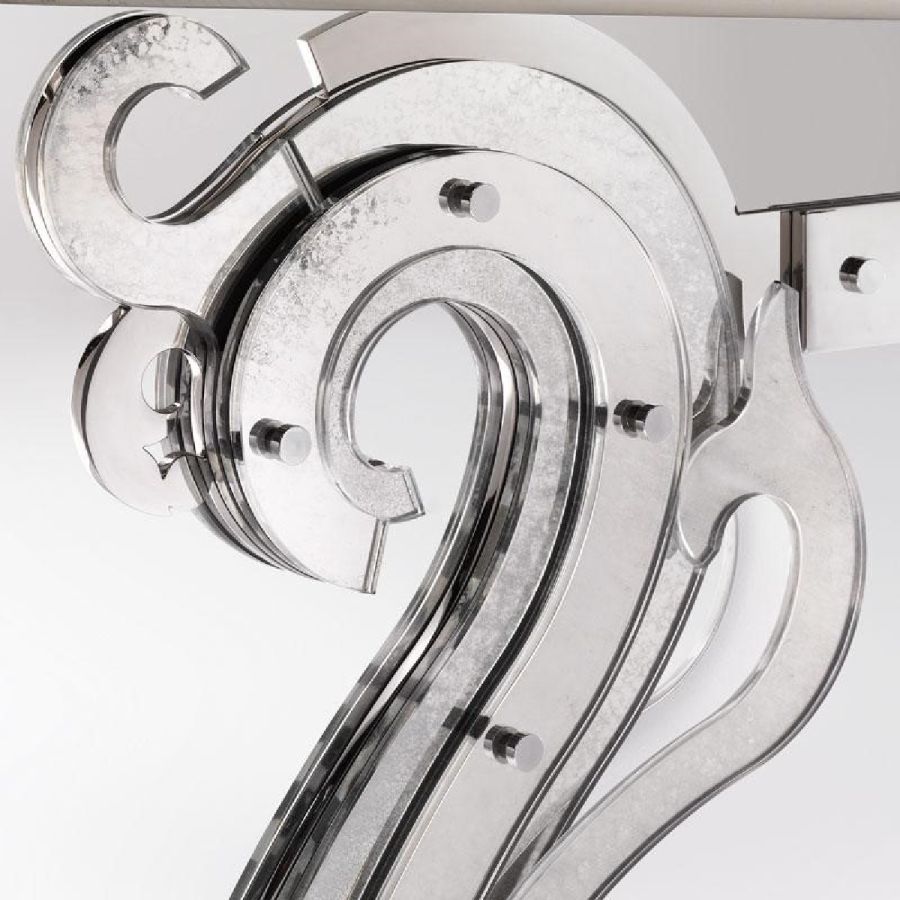Silvered glass top frame with light antique finishing. Frames in bevelled glass, engraved and silvered with light antique finishing.