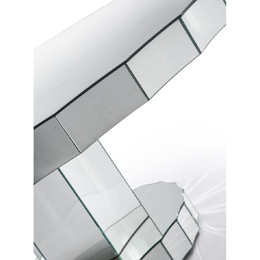 Table in curved and antiqued mirror. Structure in wood veneer finished in oak colour.