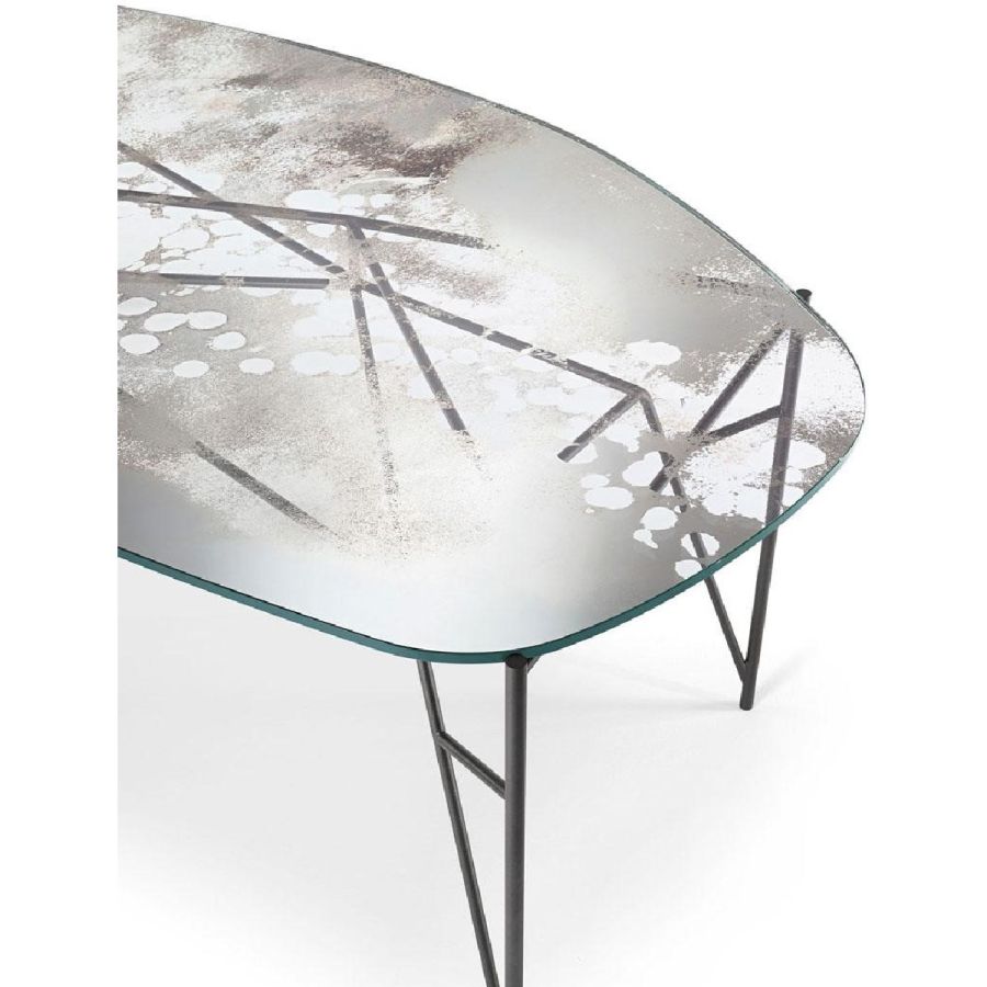 Metal structure with black matte finish. Oval-shaped top made of glass with medium antique mirrored finish and partially transparent according to a spotted artistic motif.