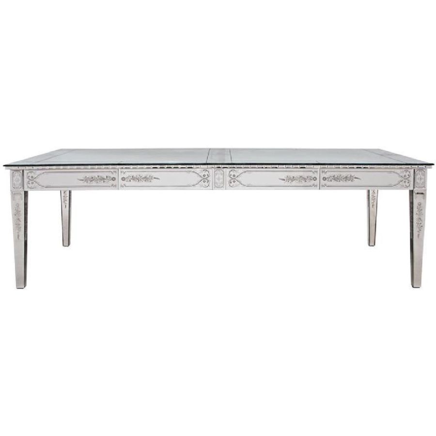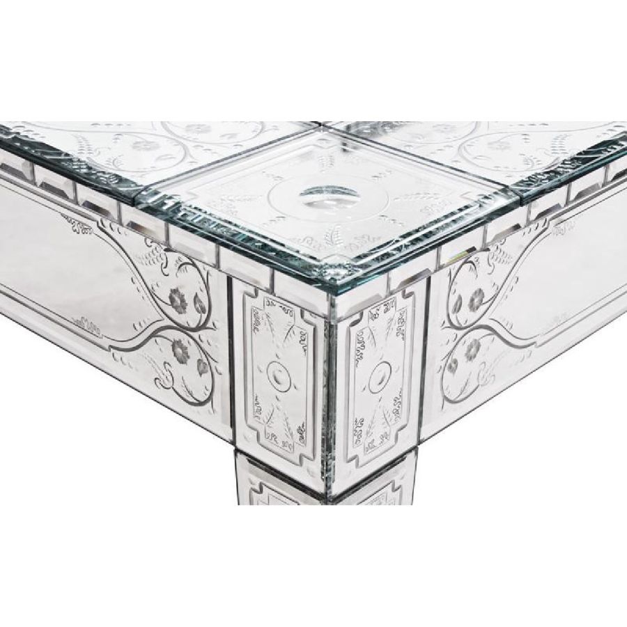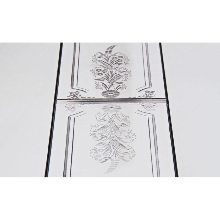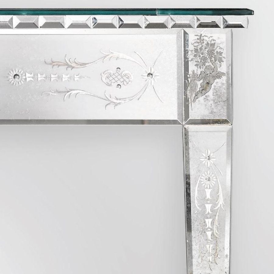 Central part of the top made of medium antique mirrored glass. Frames made of bevelled and engraved glass with medium antique mirrored finish.