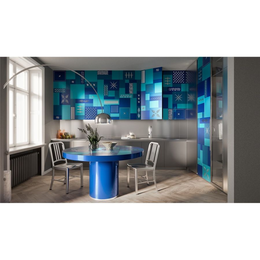 Shiny deep blue lacquered plywood structure. Top with extra-clear acid etched 6 mm thick glass varnished in multicolour and decorated with silver hand engravings.