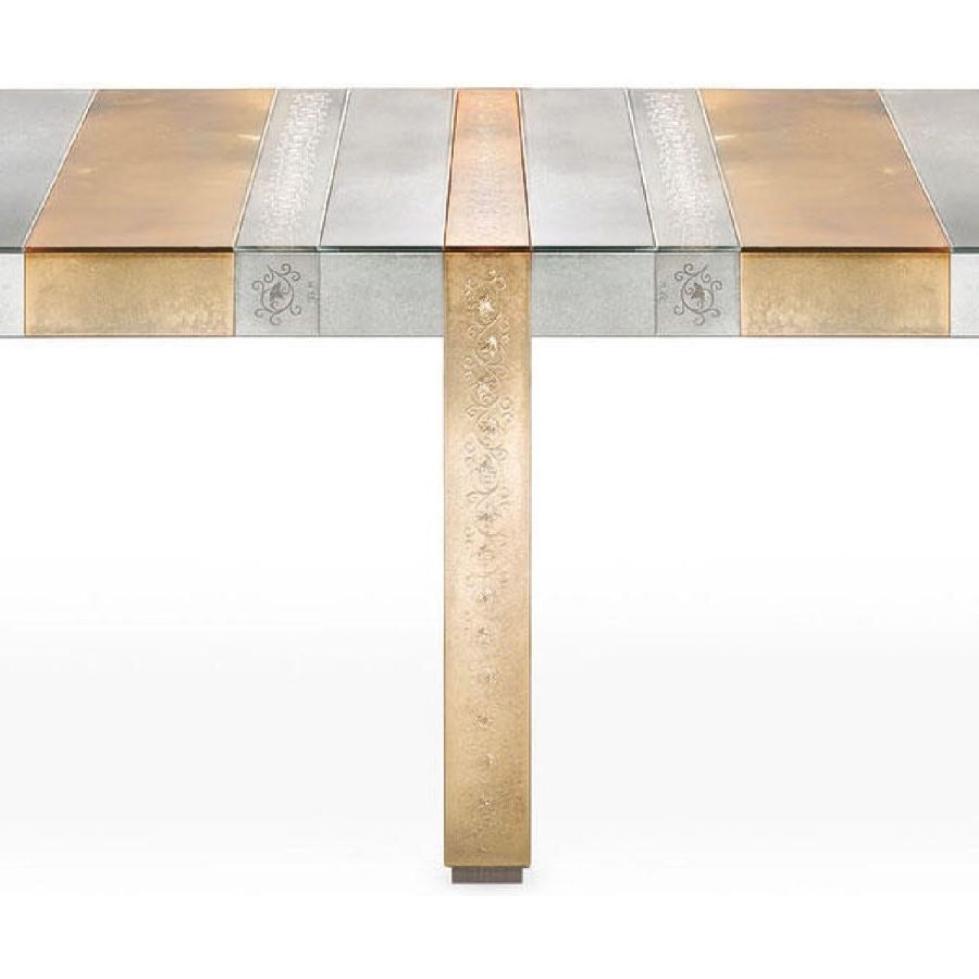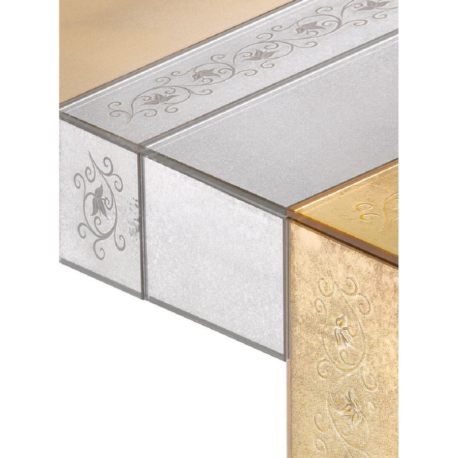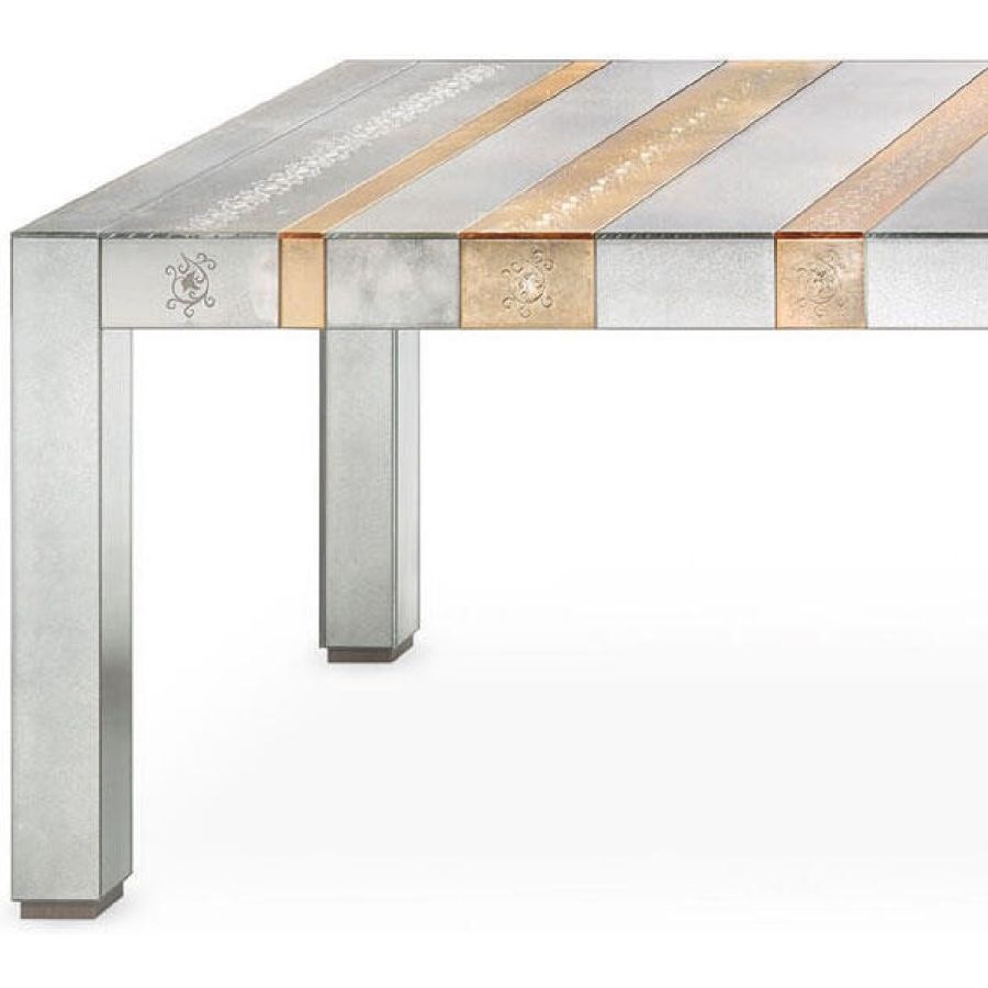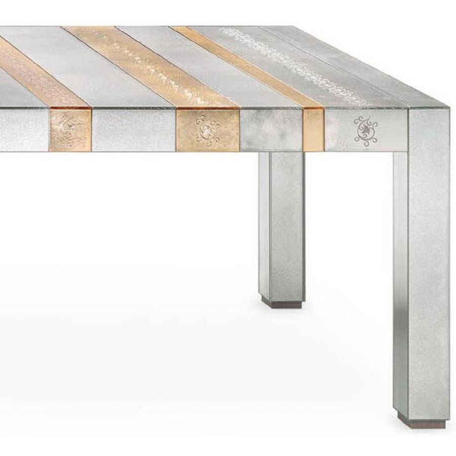 Table with bands in antiqued mirror and multicoloured glass with floral handmade engravings.