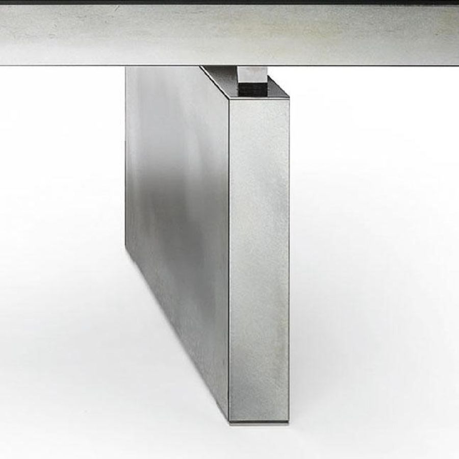 Glass table, partially finished in “Lagune” style antiqued mirror. Structure in veneered wood finished in oak with shiny stainless steel details.