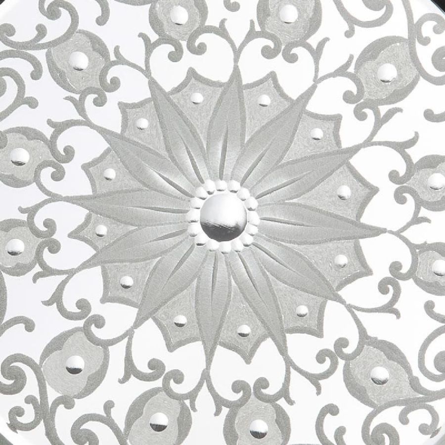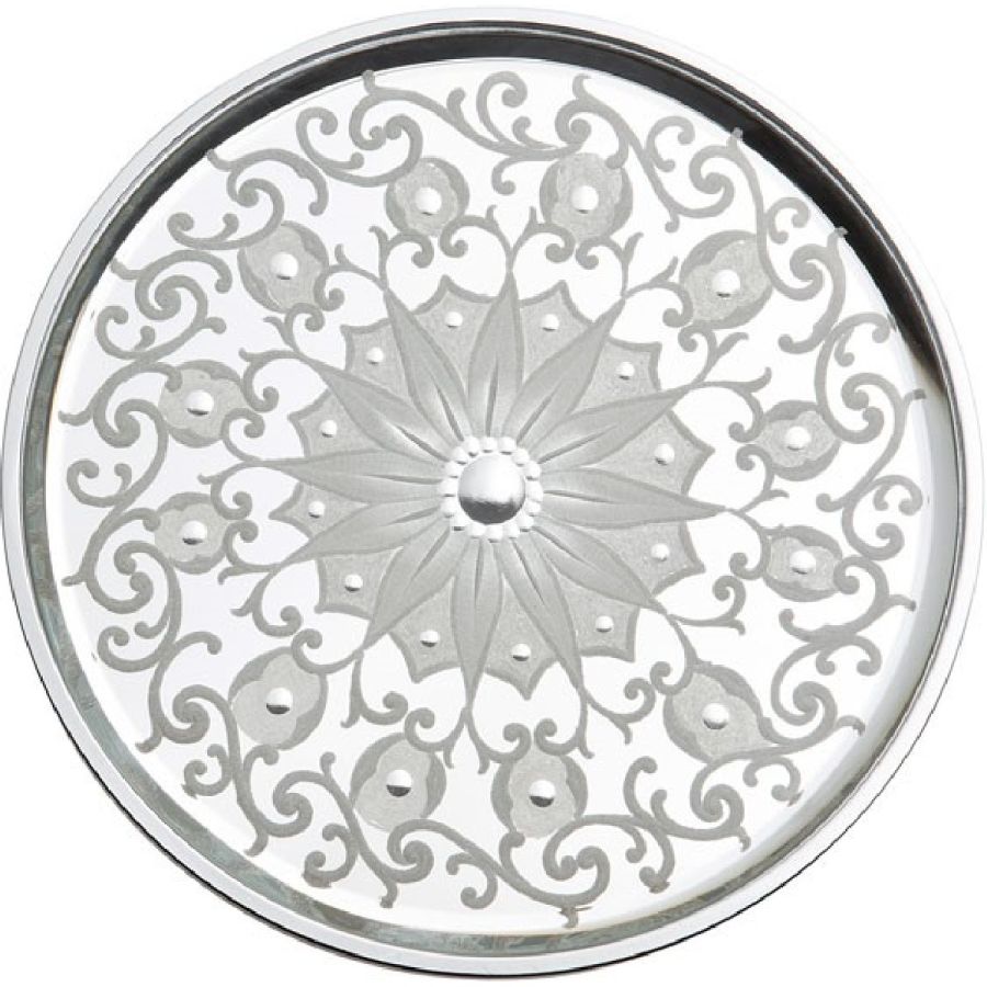 Floral motif and shiny sphere engravings.