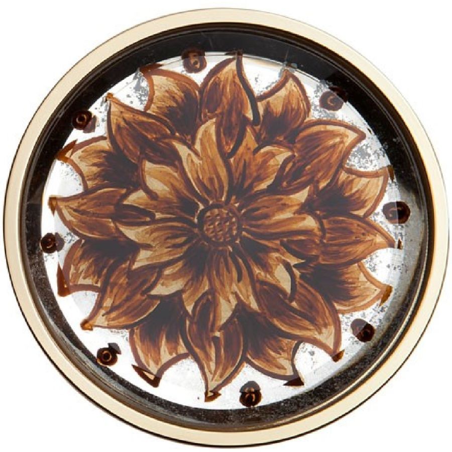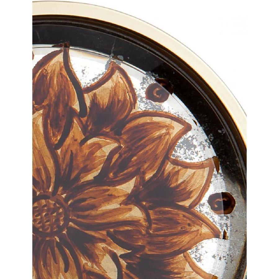 Glass painting of a gold and amber floral motif.