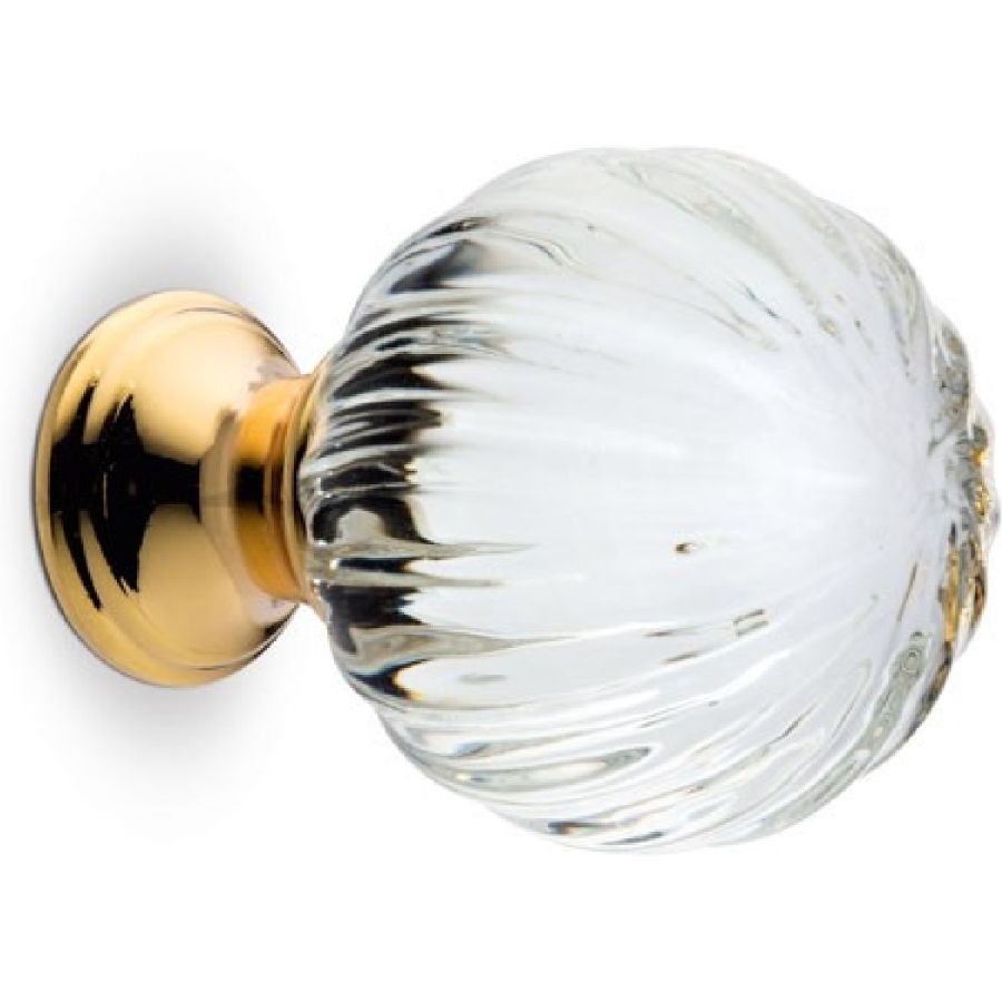 Structure made of brass with shiny chrome-plated or golden finish. Round glass knobs with striped crystal coloured finish.