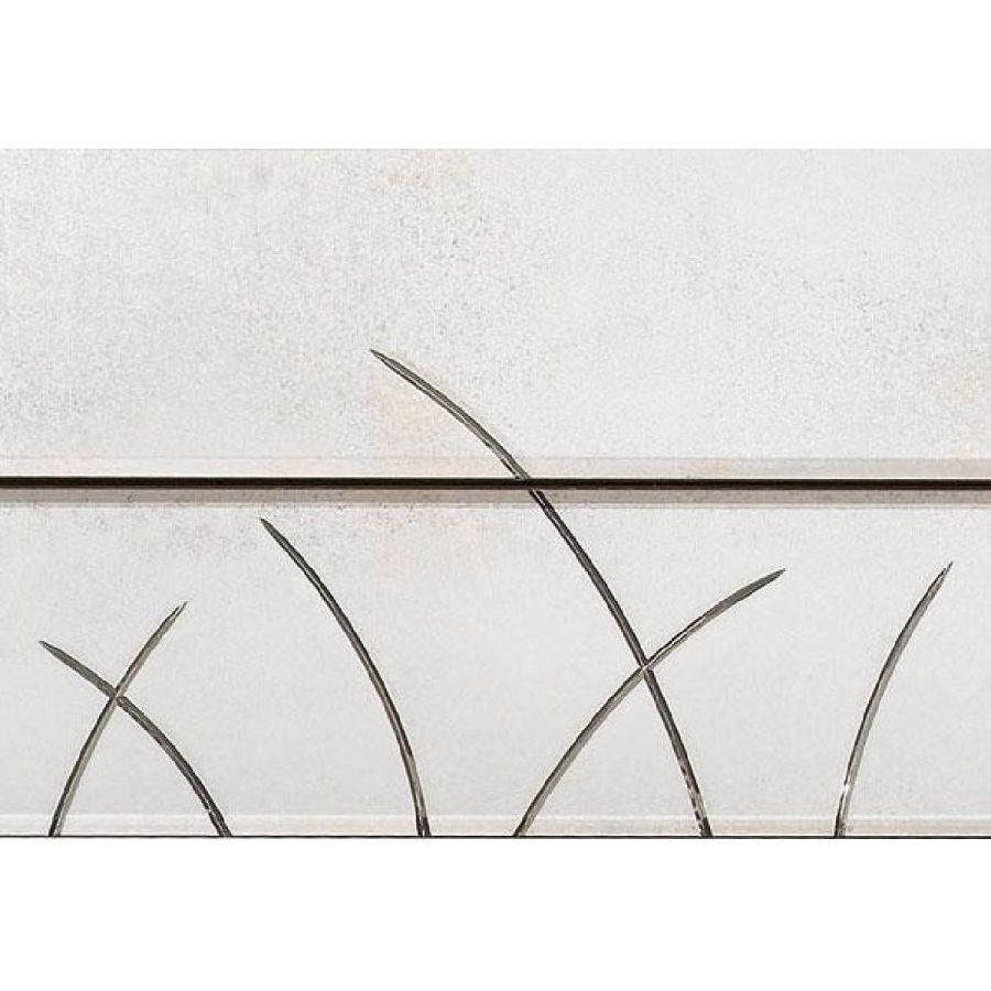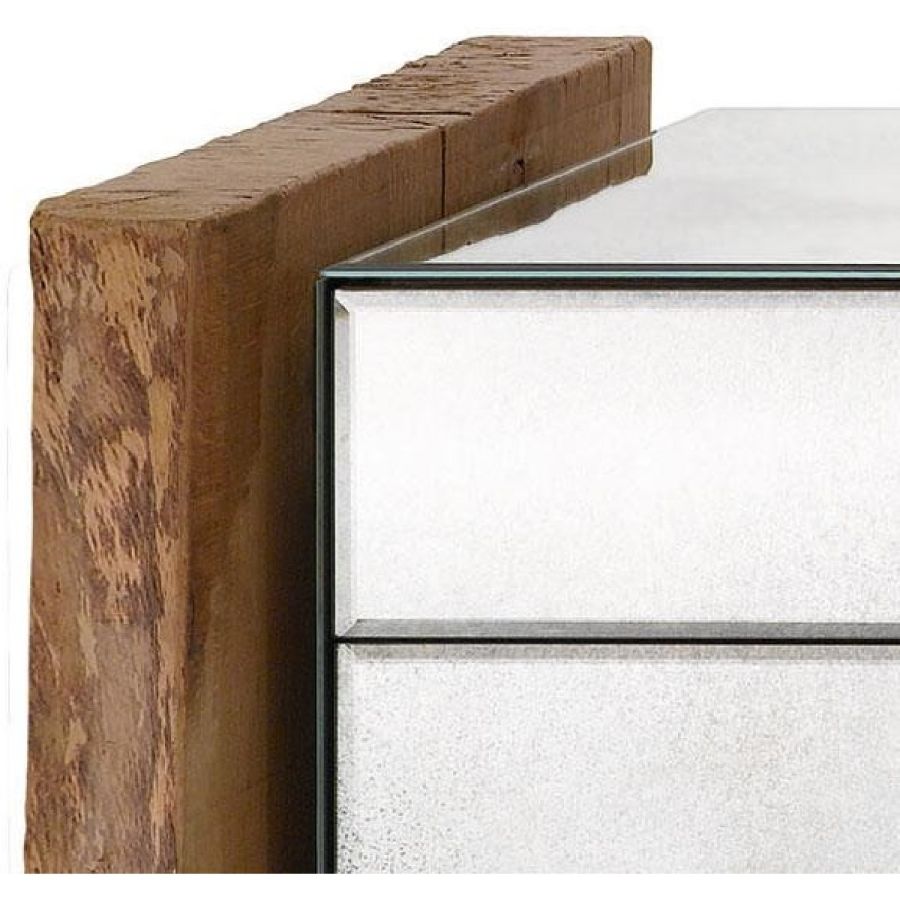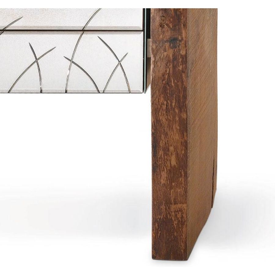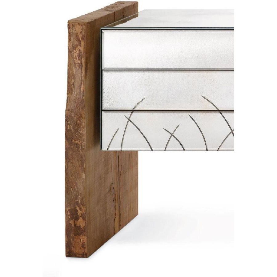 Three drawers-chest in antiqued mirror with shiny handmade engravings. Structure and sides in solid oak.